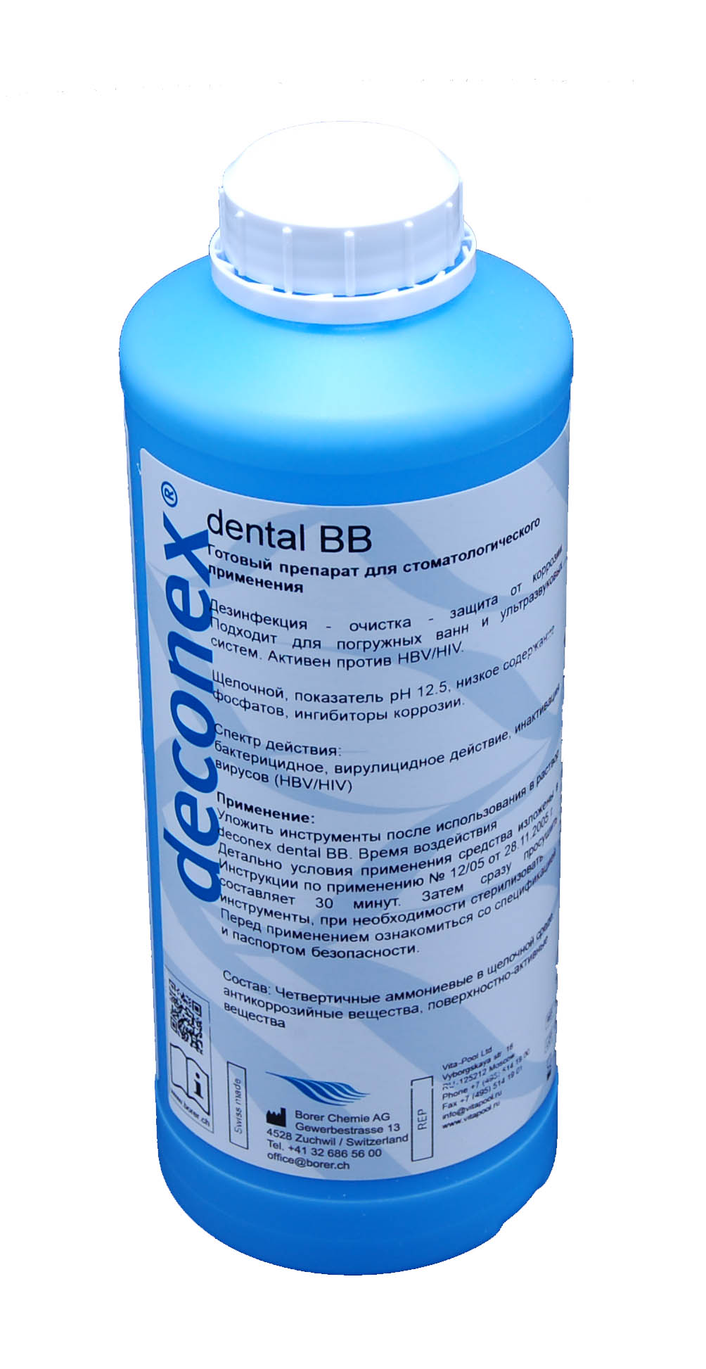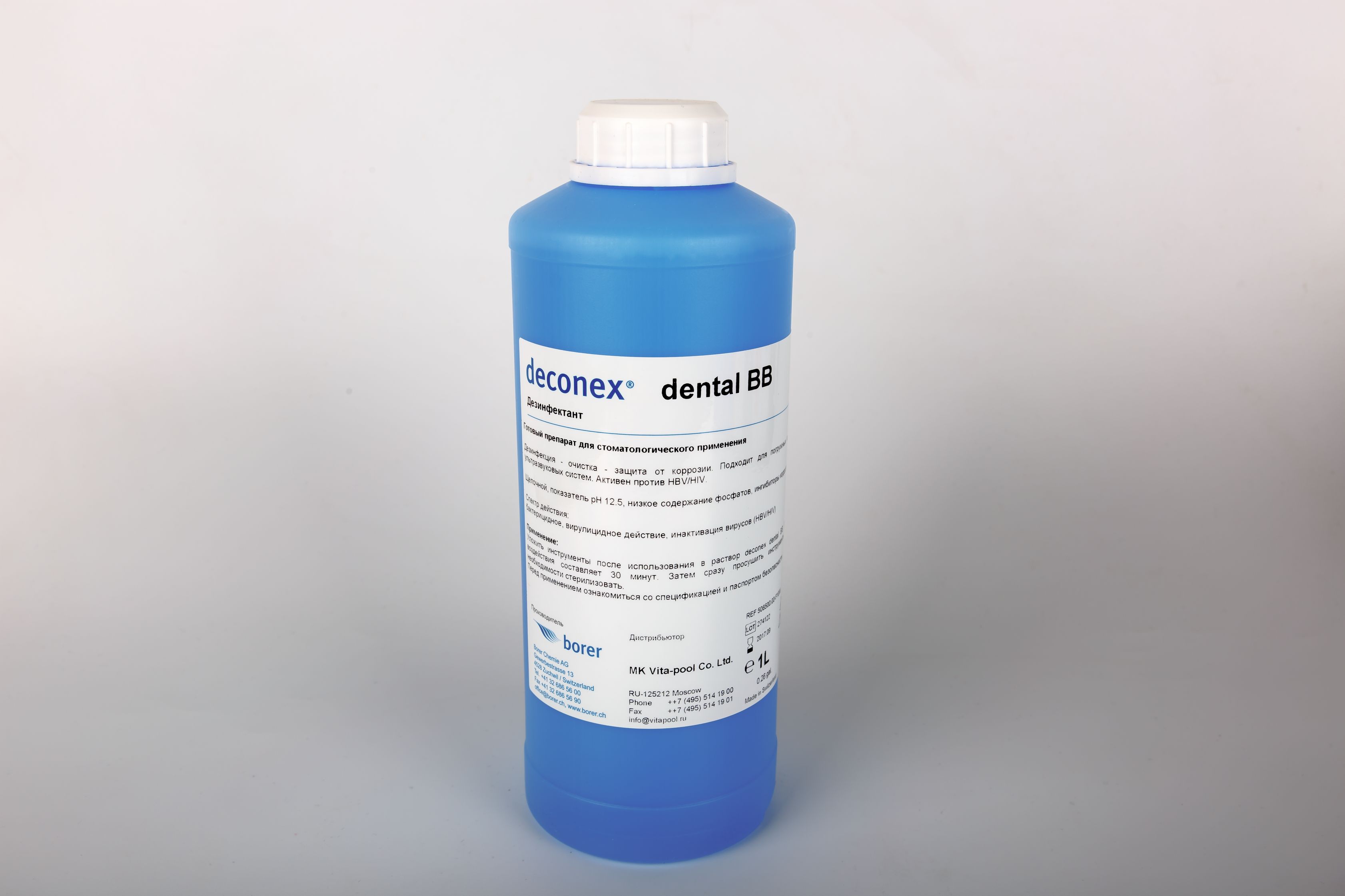 Готовый раствор светло-голубого цвета. Обладает дезинфицирующими свойствами. Эффективен на предстерилизационном этапе очистки стоматологических ротационных приспособлений, таких как боры, дрильборы и прочих. Возможно использование как в ручной чистке, так и в механизированной, осуществляемой при помощи ультразвука.