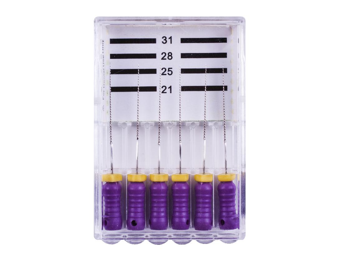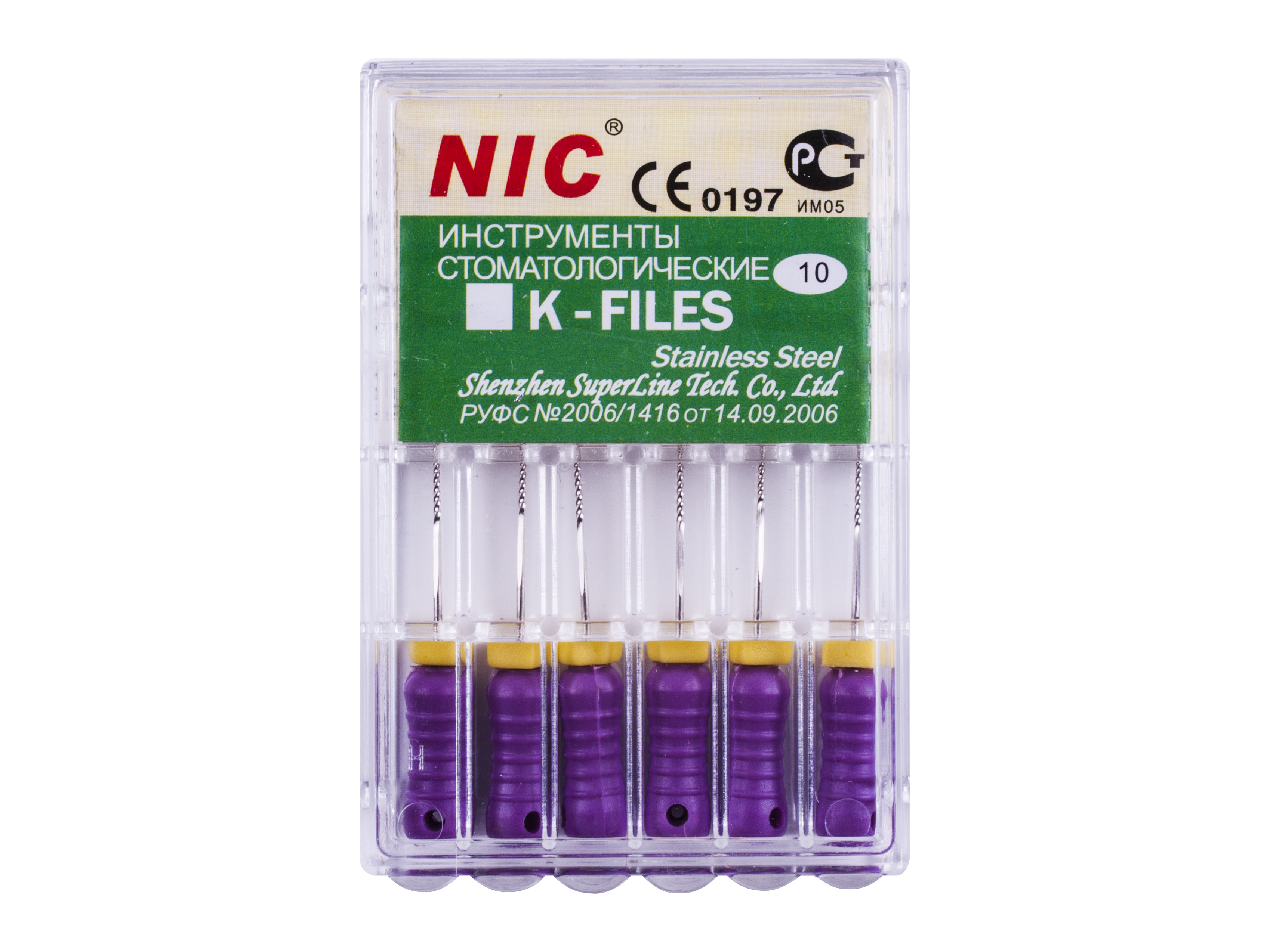 Эндодонтический инструмент из хромоникелевой стали для выполнения процедур по расширению просвета зубного канала и придания ему необходимой формы. Высокая эффективность К-Файлов обеспечивается оптимальным количеством витков спирали с режущими элементами. Файлы снабжены пластиковой ручкой и силиконовым стопором, обладают высокой гибкостью и механической прочностью.