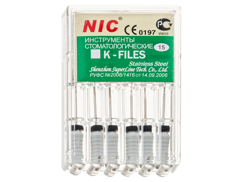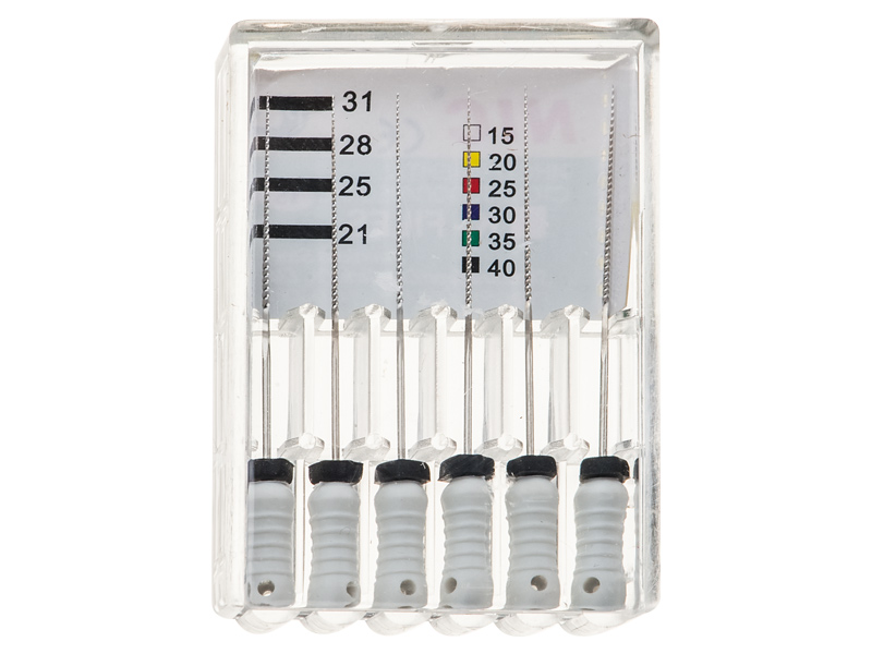 Эндодонтический инструмент из хромоникелевой стали для выполнения процедур по расширению просвета зубного канала и придания ему необходимой формы. Высокая эффективность К-Файлов обеспечивается оптимальным количеством витков спирали с режущими элементами. Файлы снабжены пластиковой ручкой и силиконовым стопором, обладают высокой гибкостью и механической прочностью.