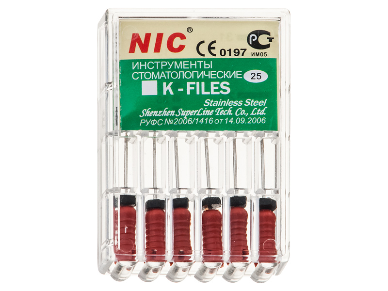 Эндодонтический инструмент из хромоникелевой стали для выполнения процедур по расширению просвета зубного канала и придания ему необходимой формы. Высокая эффективность К-Файлов обеспечивается оптимальным количеством витков спирали с режущими элементами. Файлы снабжены пластиковой ручкой и силиконовым стопором, обладают высокой гибкостью и механической прочностью.