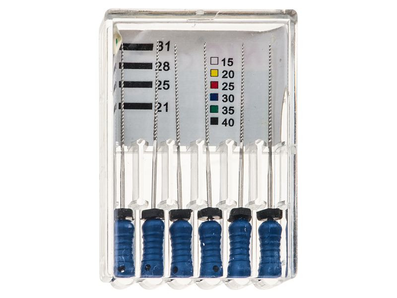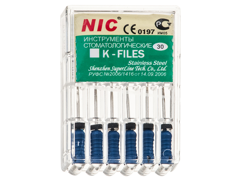 Эндодонтический инструмент из хромоникелевой стали для выполнения процедур по расширению просвета зубного канала и придания ему необходимой формы. Высокая эффективность К-Файлов обеспечивается оптимальным количеством витков спирали с режущими элементами. Файлы снабжены пластиковой ручкой и силиконовым стопором, обладают высокой гибкостью и механической прочностью.