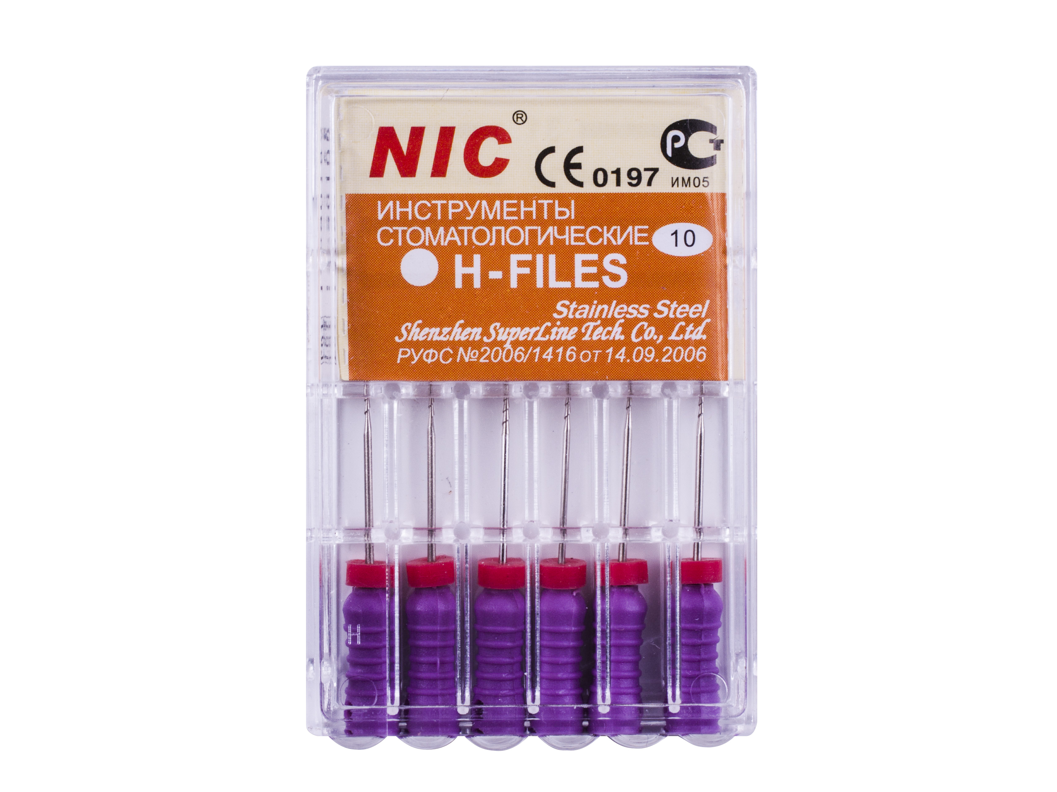H-файлы 10 длиной 28 мм со спиралевидной рабочей частью для качественной подготовки зубных каналов. Материалы изготовления: режущая честь – нержавейка, ручка – пластик, ограничитель – силикон. Прекрасные рабочие характеристики файлов обусловлены формой рабочей части и гибкостью инструмента. Конусность – 0,02.