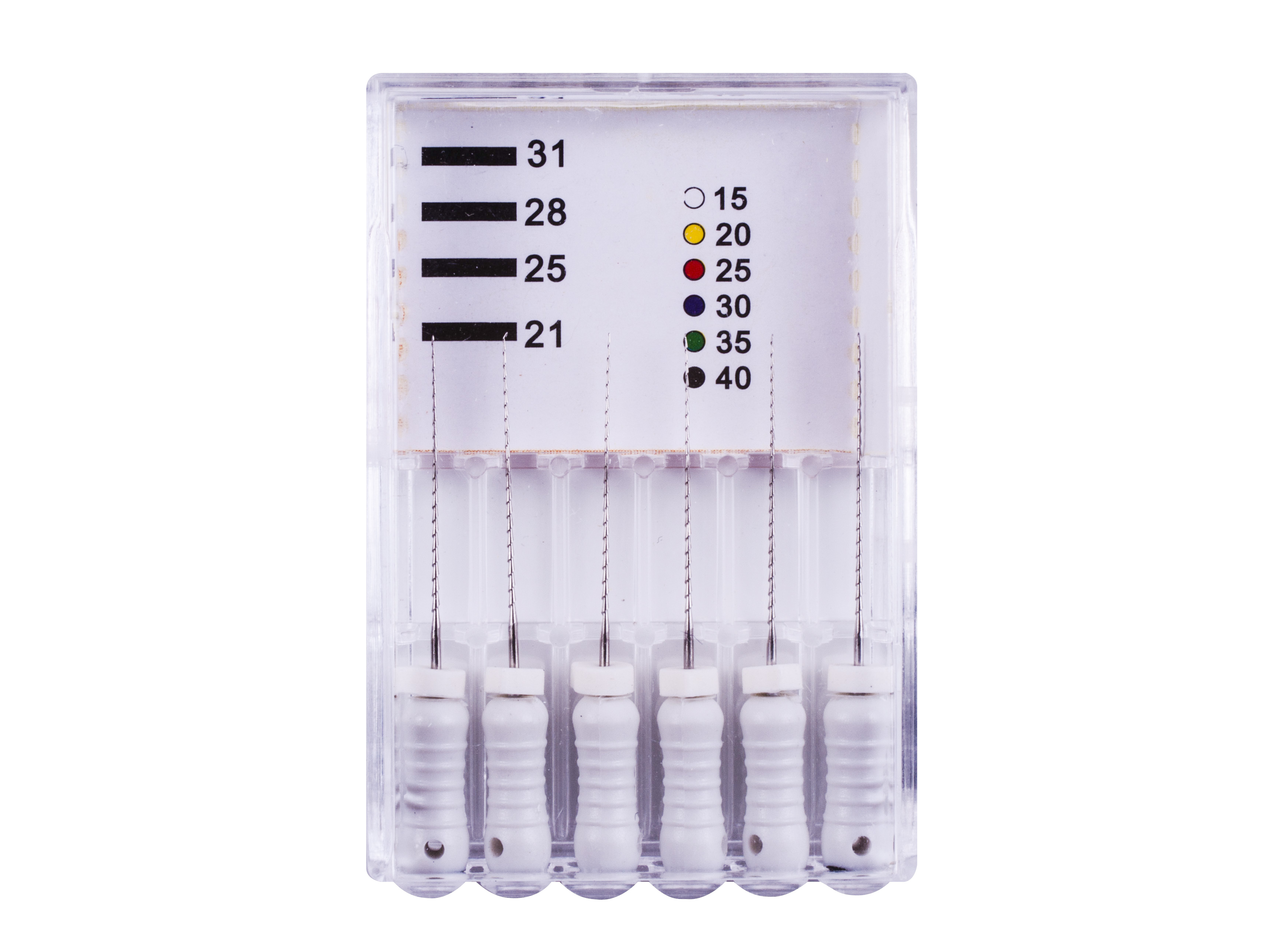 Комплект эндофайлов15 длиной 21 мм для выравнивания стенок зубных каналов. Материал изготовления – нержавеющая сталь. Имеет круглое сечение и спиралевидную рабочую часть. Обладает превосходной гибкостью, позволяющей обрабатывать каналы любой формы. Снабжены пластиковой ручкой и силиконовым ограничителем.