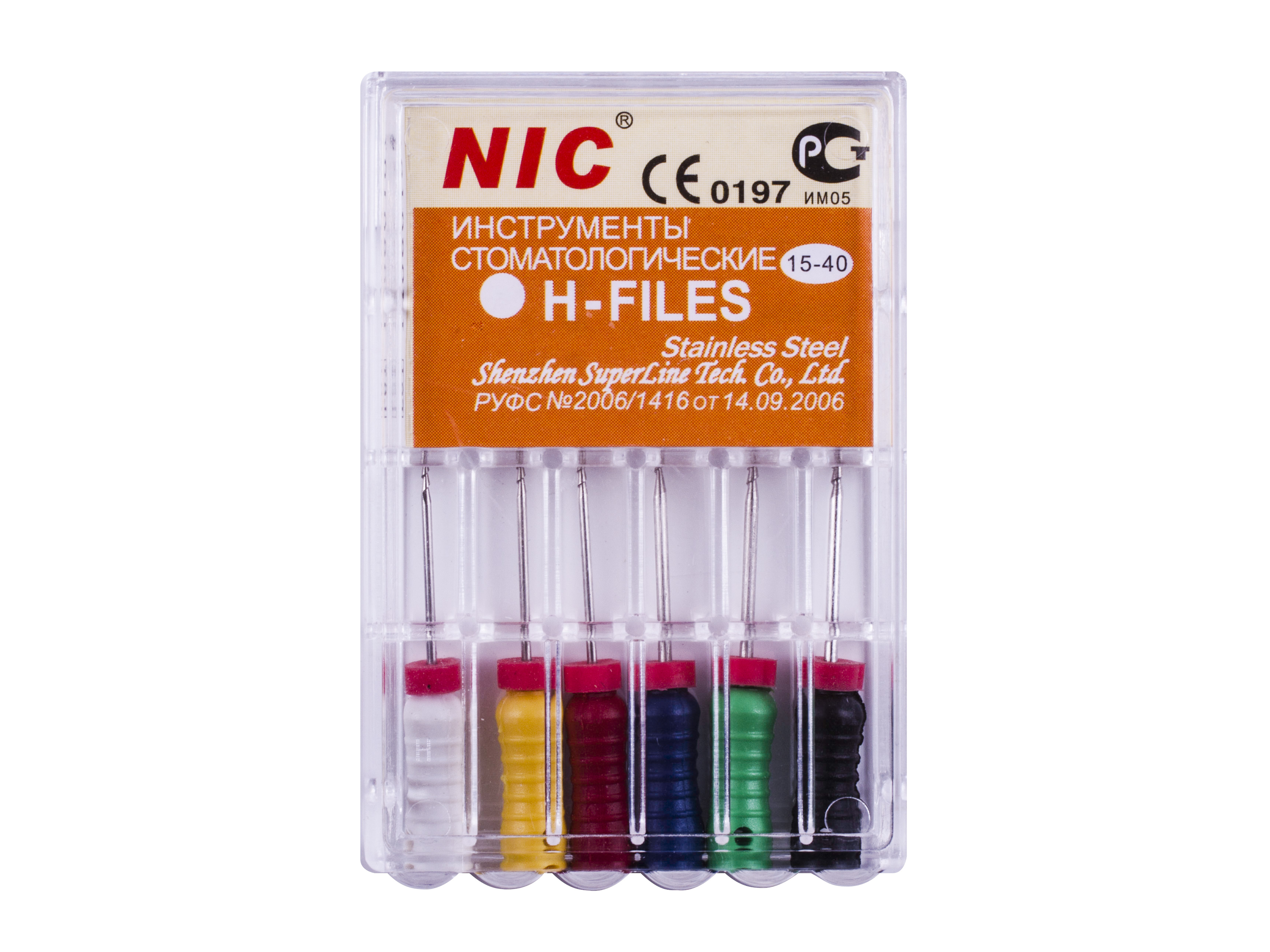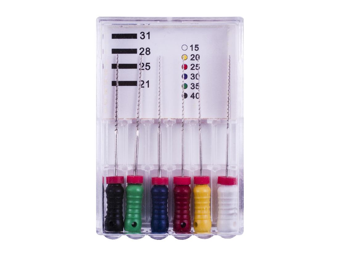 Набор эндодонтических инструментов для обработки стенок корневых каналов со спиралевидной нарезкой рабочей части. Буравы 15/40 длиной 28 мм изготовлены из нержавеющей стали, снабжены пластиковыми ручками и силиконовым ограничителем. Имеют круглое сечение и обладают оптимальными показателями гибкости, что позволяет инструменту адаптироваться под любой канал. Конусность – 0,02.