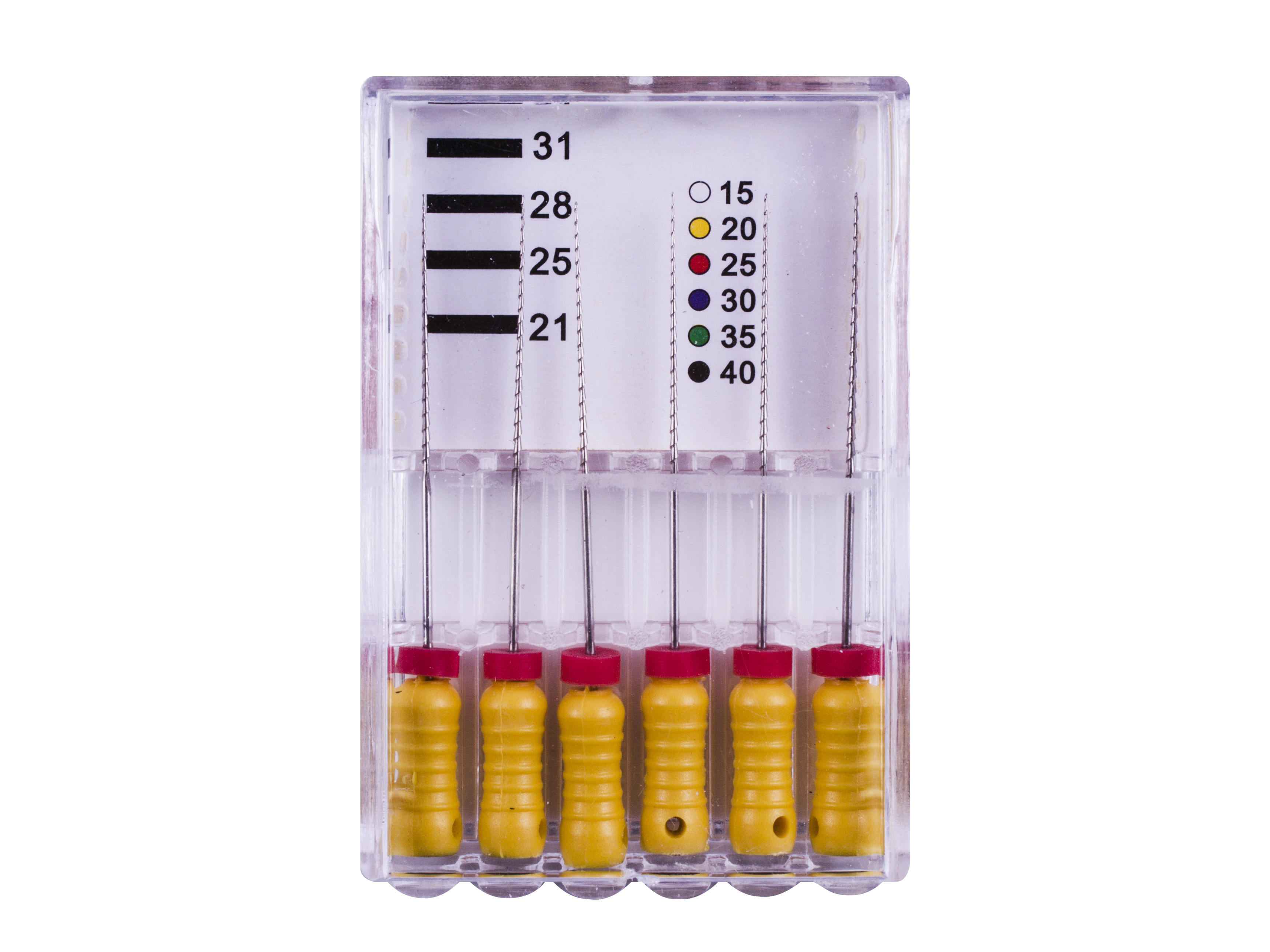 H-Файлы 20 длиной 28 мм с круглым сечением и нарезкой рабочей части в виде спирали. Исключительная гибкость и конструктивные особенности инструмента позволяют проводить высококачественную обработку стенок корневых каналов. Файлы изготавливаются из нержавеющей стали, оснащаются пластиковой ручкой и силиконовым ограничителем.