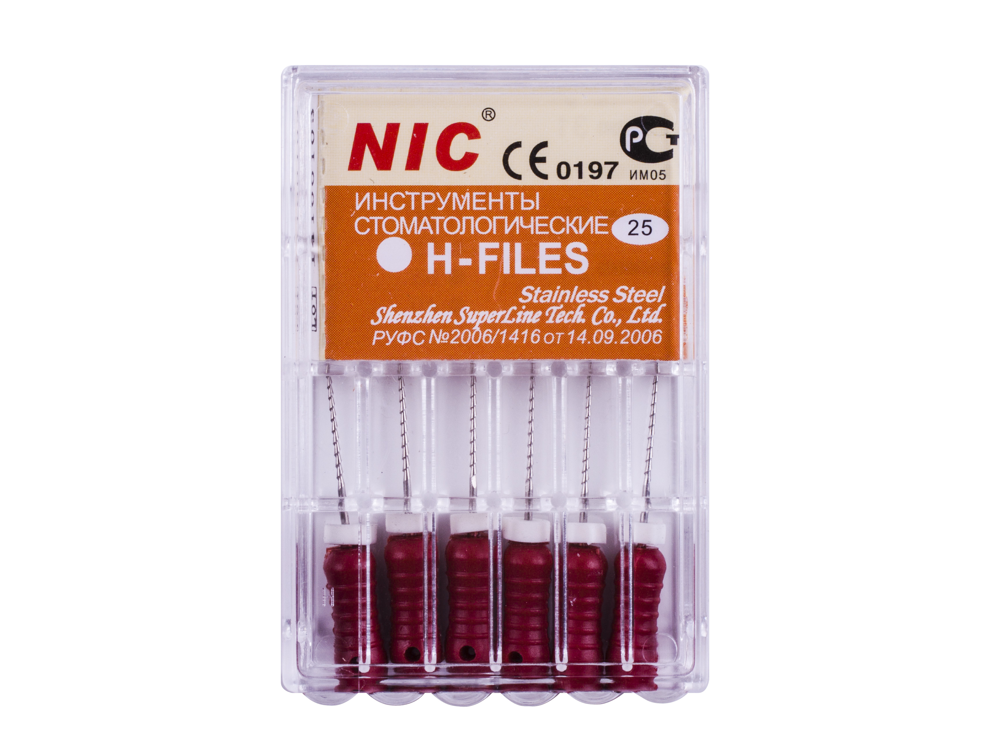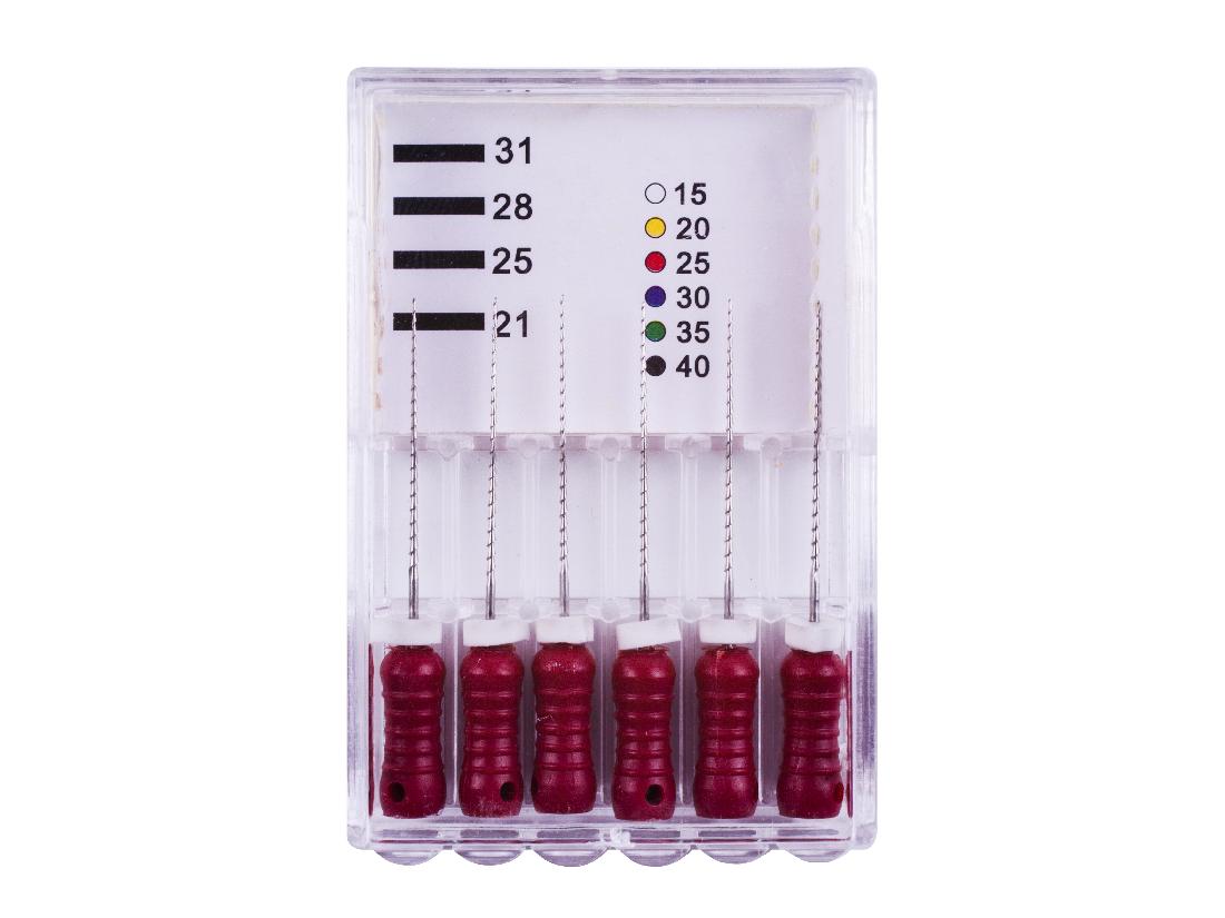 H-файлы 25 длиной 21 мм со спиралевидной рабочей частью для качественной подготовки зубных каналов. Материалы изготовления: режущая честь – нержавейка, ручка – пластик, ограничитель – силикон. Прекрасные рабочие характеристики файлов обусловлены формой рабочей части и гибкостью инструмента. Конусность – 0,02.