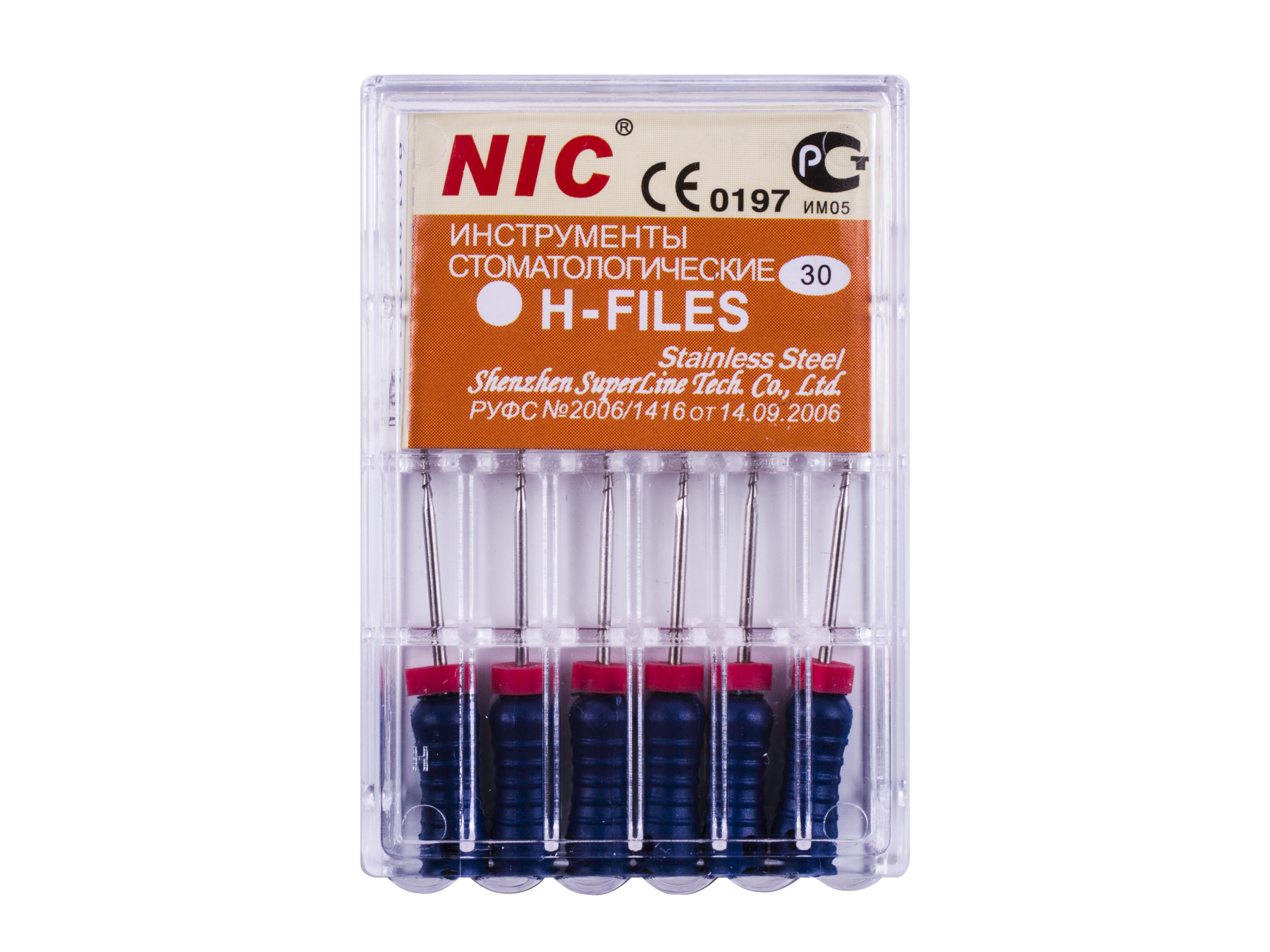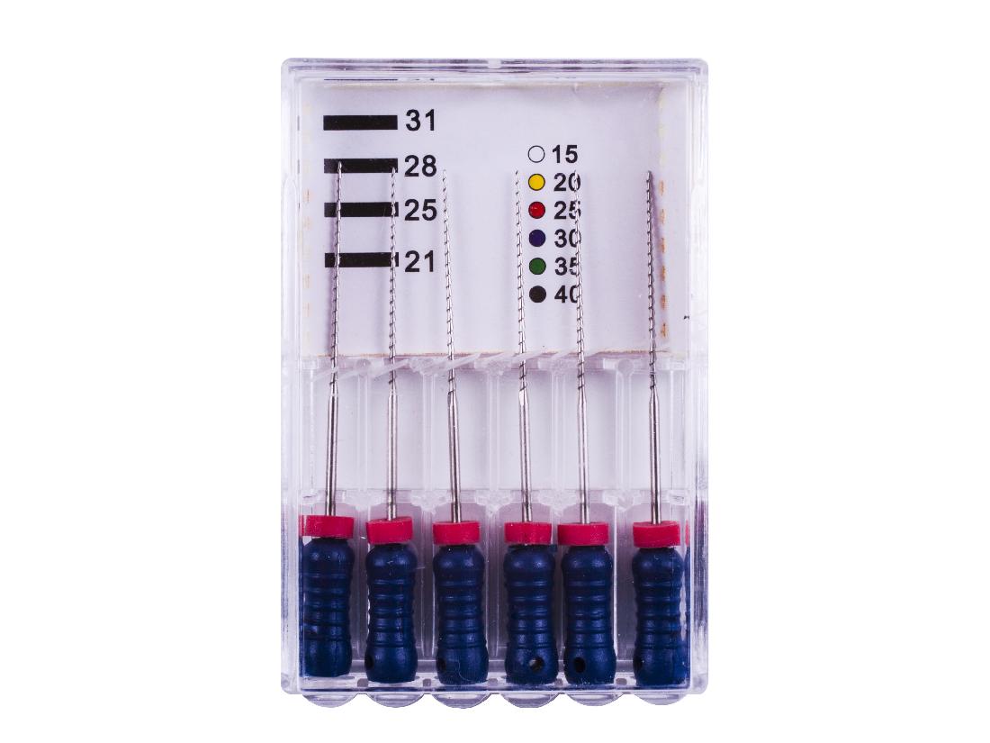 H-Файлы 30 длиной 28 мм с круглым сечением и нарезкой рабочей части в виде спирали. Исключительная гибкость и конструктивные особенности инструмента позволяют проводить высококачественную обработку стенок корневых каналов. Файлы изготавливаются из нержавеющей стали, оснащаются пластиковой ручкой и силиконовым ограничителем.