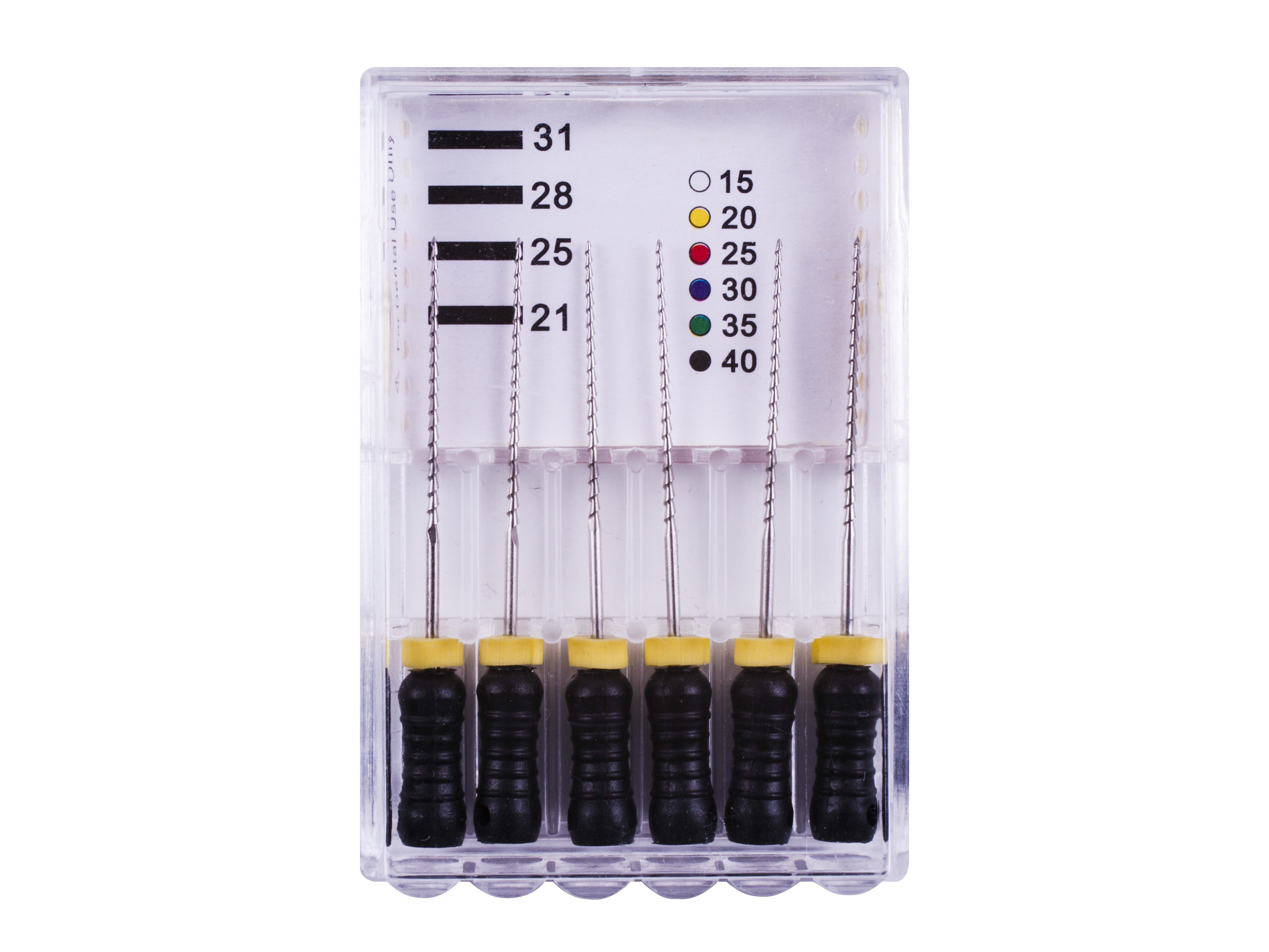H-файлы 40 длиной 25 мм со спиралевидной рабочей частью для качественной подготовки зубных каналов. Материалы изготовления: режущая честь – нержавейка, ручка – пластик, ограничитель – силикон. Прекрасные рабочие характеристики файлов обусловлены формой рабочей части и гибкостью инструмента. Конусность – 0,02.