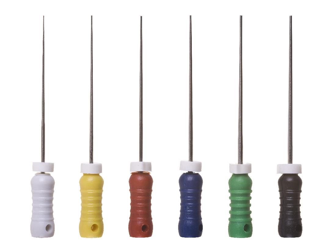 Комплект ручных эндодонтических инструментов, предназначенных для работы в зубных каналах. Изготовлены из нержавеющей медицинской стали с использованием технологии «вытягивания». Это увеличивает гибкость и вязкость инструмента. Удобная система кодировки цветом. Длина изделий 25 мм, конусность 0,02.