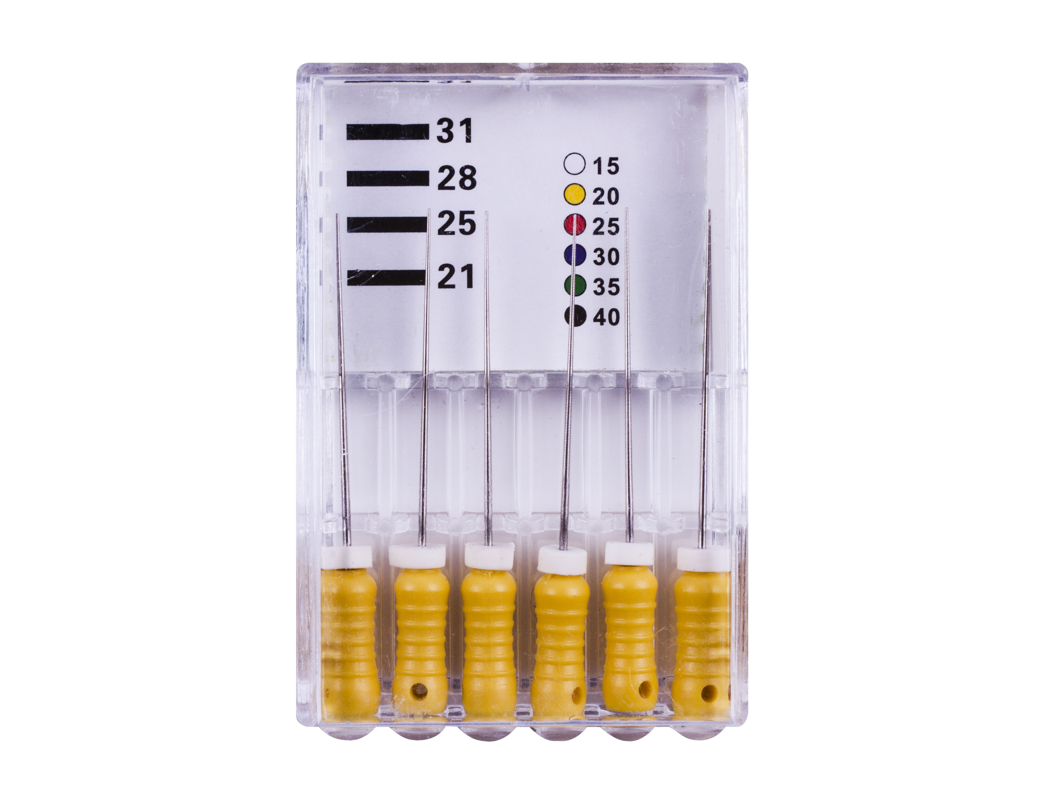Комплект ручных эндодонтических инструментов, предназначенных для работы в зубных каналах. Изготовлены из нержавеющей медицинской стали с использованием технологии «вытягивания». Это увеличивает гибкость и вязкость инструмента. Четкая и удобная система кодировки цветом. Длина всех изделий 25 мм, конусность 0,02.