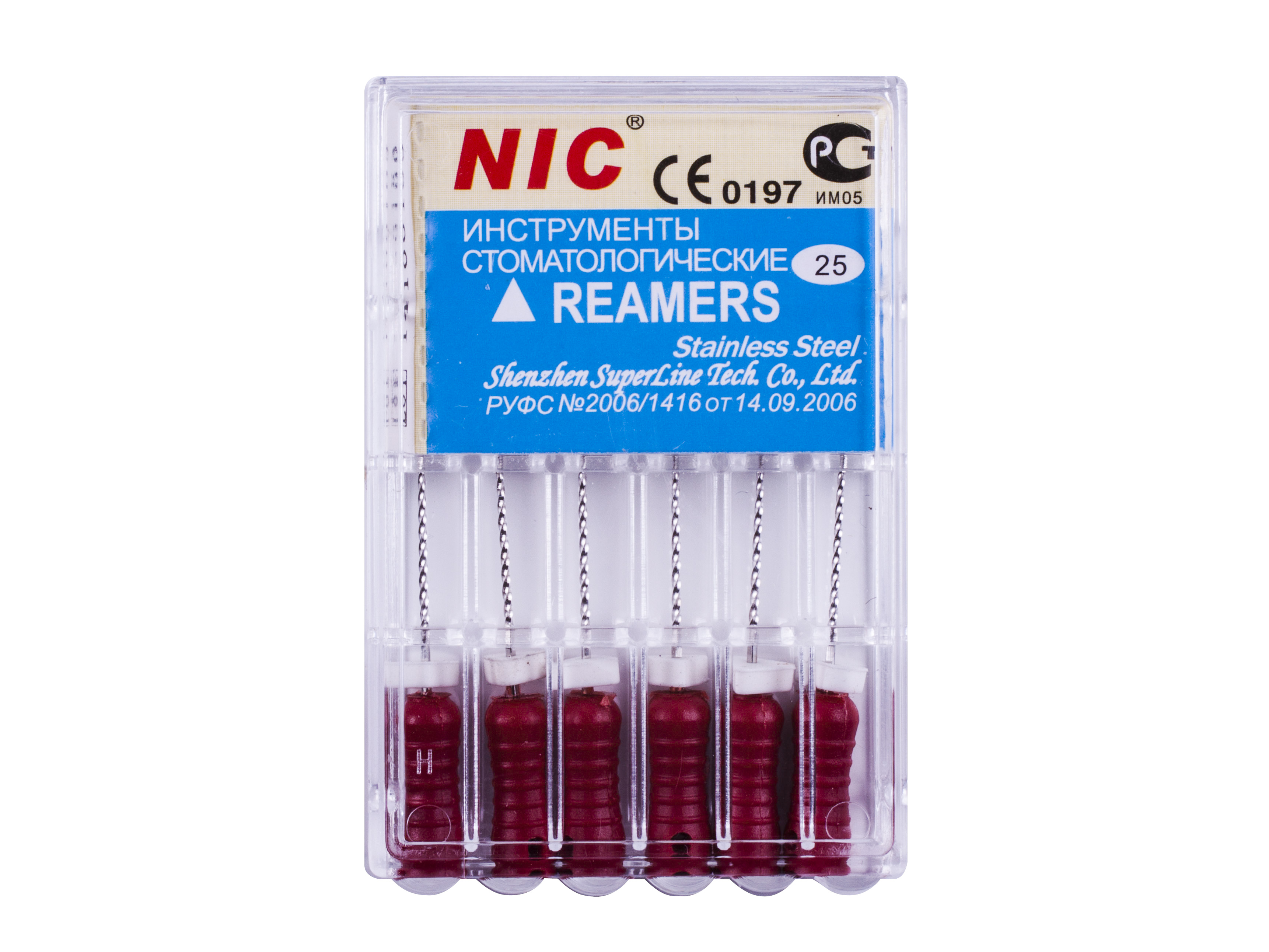 Ример 25-21 с коэффициентом заострения 7/100. Используется для обработки зубных каналов и придания им требуемой формы. Имеет треугольное сечение, обеспечивает высокую точность работы, благодаря трём точкам соприкосновения. Оснащён большим по сравнению с хвостовиком диметром лезвия. Снабжён силиконовым стопором. Цвет – красный.