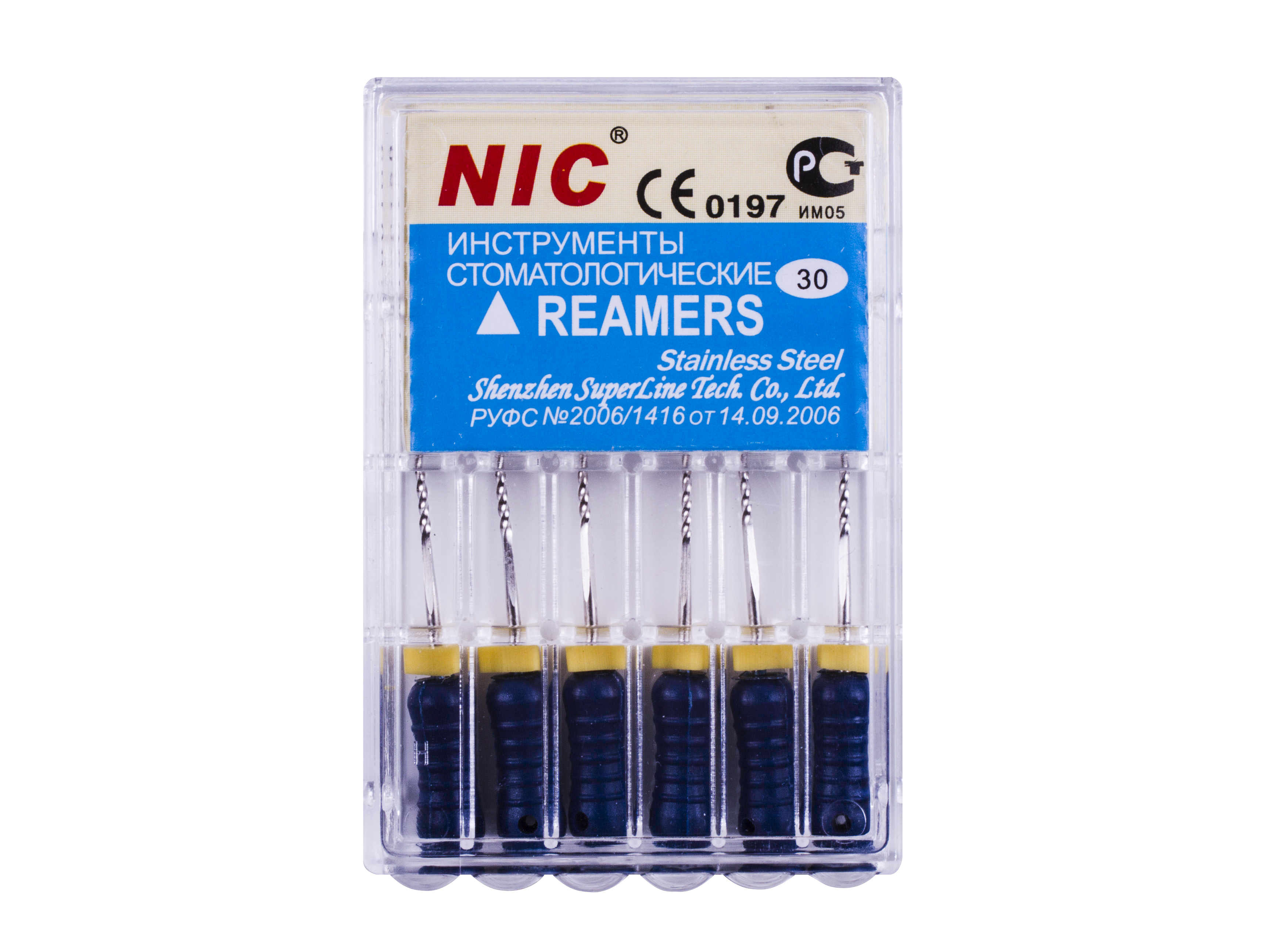 Ример 30-25 с коэффициентом заострения 7/100. Используется для обработки зубных каналов и придания им требуемой формы. Имеет треугольное сечение, обеспечивает высокую точность работы, благодаря трём точкам соприкосновения. Оснащён большим по сравнению с хвостовиком диметром лезвия. Снабжён силиконовым стопором. Цвет – синий.