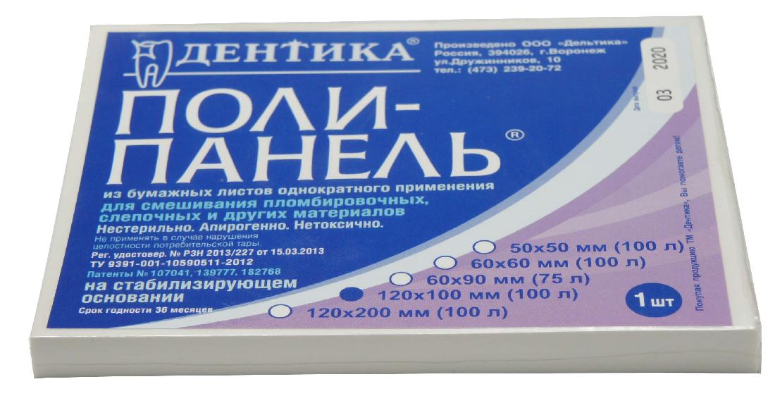 Удобный инструмент в помощь стоматологу. Представляет собой специальную панель из 100 листов, покрытых качественным пластиком. Листы имеют большую прочность и не размокают. Панель жестко фиксируется на поверхности стола. Служит для замешивания любых пломбировочных или слепочных материалов и не имеет противопоказаний. По окончании работы листок, который был использован, легко отрывается и выбрасывается. Размер листов 100Х120мм.