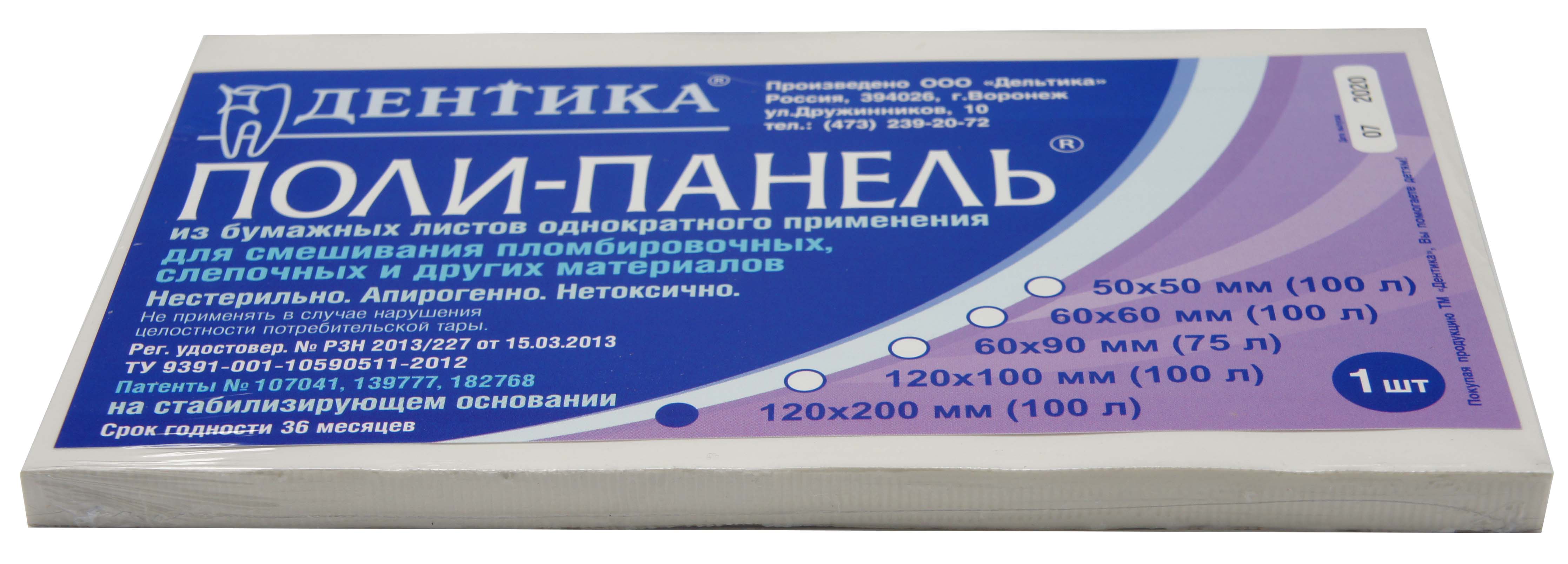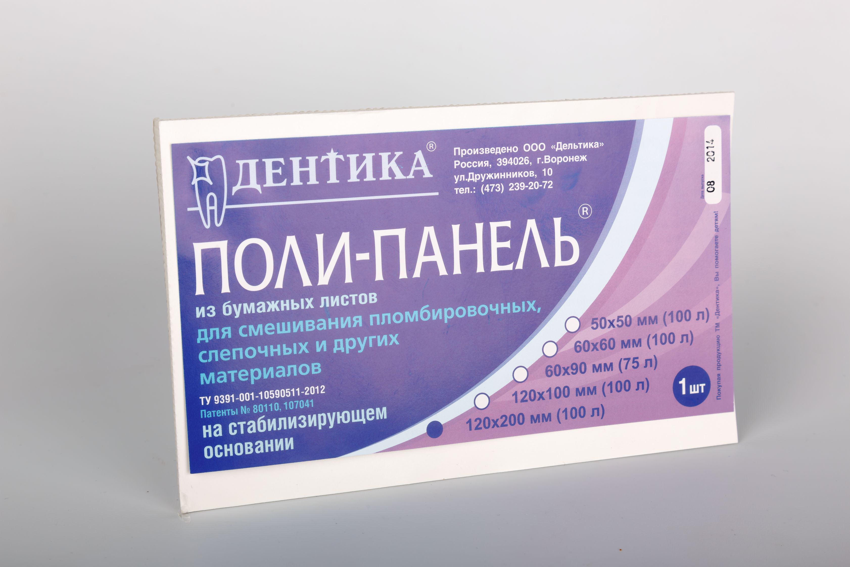 Представляет собой специальную панель из 100 листов, покрытых качественным пластиком. Листы обладают большой прочностью и не размокают. Панель жестко фиксируется на поверхности стола. Применяется для замешивания любых пломбировочных или слепочных материалов и не имеет противопоказаний. По окончании работы листок, который был использован, легко отрывается и выбрасывается. Размер листов 120Х200мм.