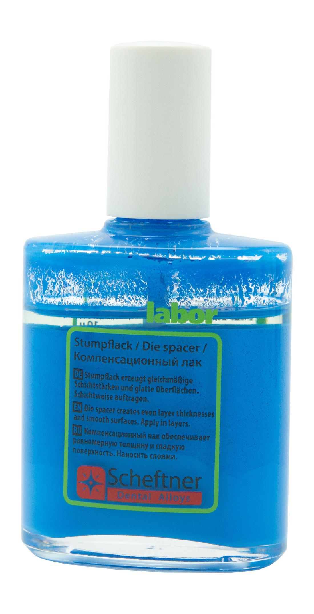 Штумпфлак голубой применяется для компенсации зазора между зубной культей и коронкой. Используется для нанесения покрытия на поверхности из гипса или кавиплан-воска. Достоинства лака: малое время высыхания, обладает оптимальной вязкостью. Один шар лака – 10 мкм.