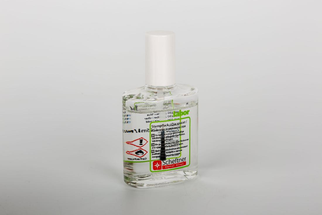 Штумпфлак прозрачный применяется для компенсации зазора между зубной культей и коронкой. Используется для нанесения покрытия на поверхности из гипса или кавиплан-воска. Достоинства лака: малое время высыхания, обладает оптимальной вязкостью. Один шар лака – 4 мкм.