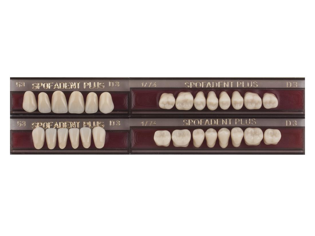 Акриловые зубы - цвет D3, для изготовления зубных протезов съёмного типа. Производятся из сополимеров метилметакрилата. К достоинствам пластмассовых зубов Спофадент Плюс можно отнести высокую цветостабильность, химическую стойкость, устойчивость к истиранию. Комплект – 28 зубов.