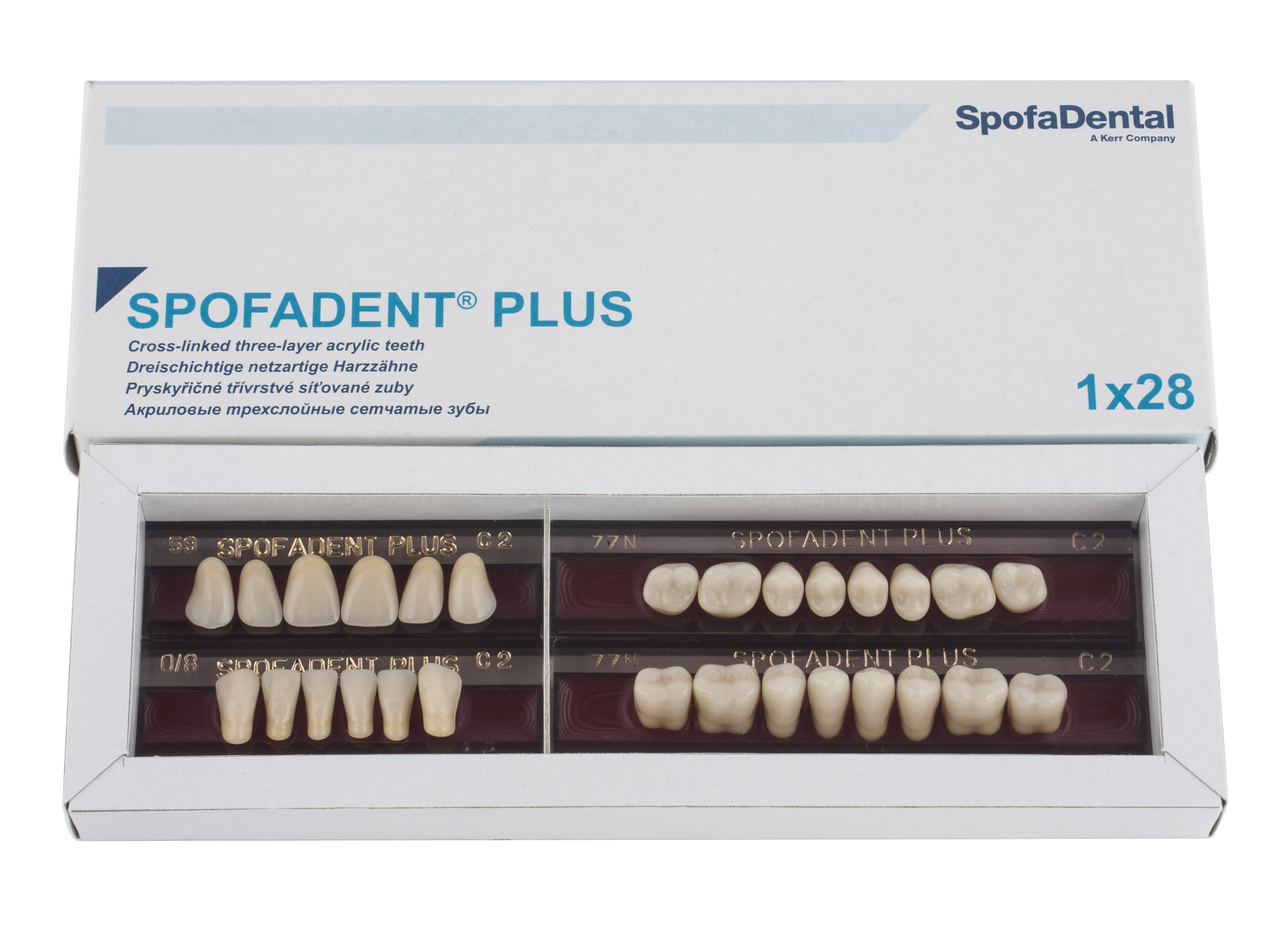 Акриловые зубы - цвет С2, для изготовления зубных протезов съёмного типа. Производятся из сополимеров метилметакрилата. К достоинствам пластмассовых зубов Спофадент Плюс можно отнести высокую цветостабильность, химическую стойкость, устойчивость к истиранию. Комплект – 28 зубов.