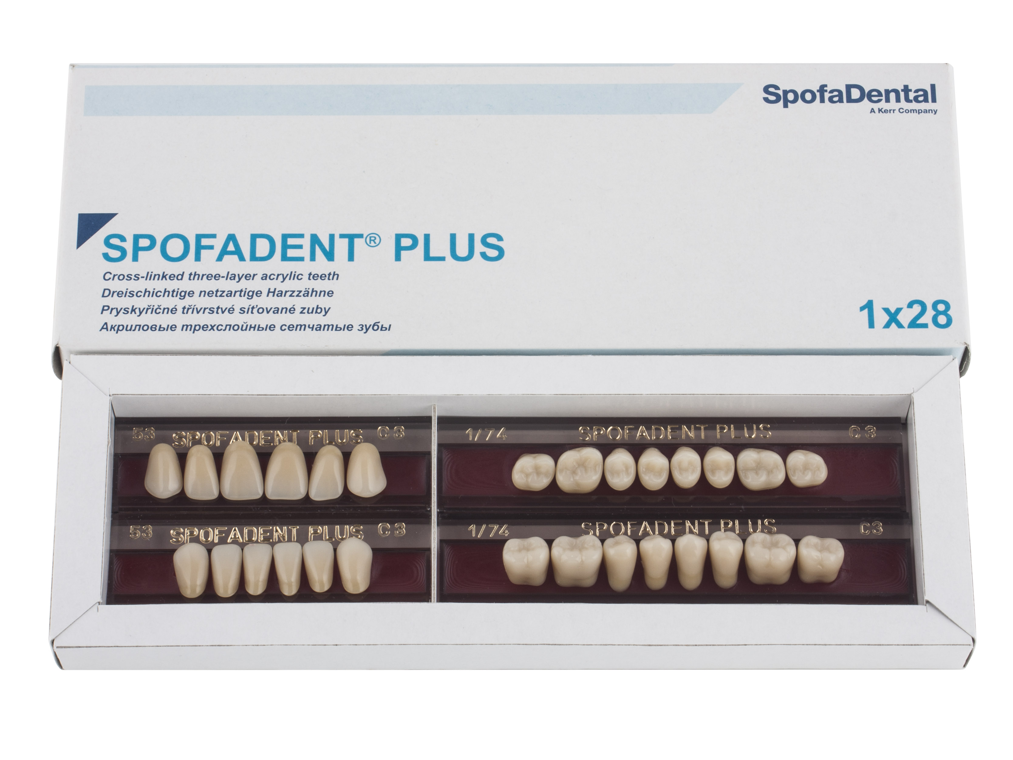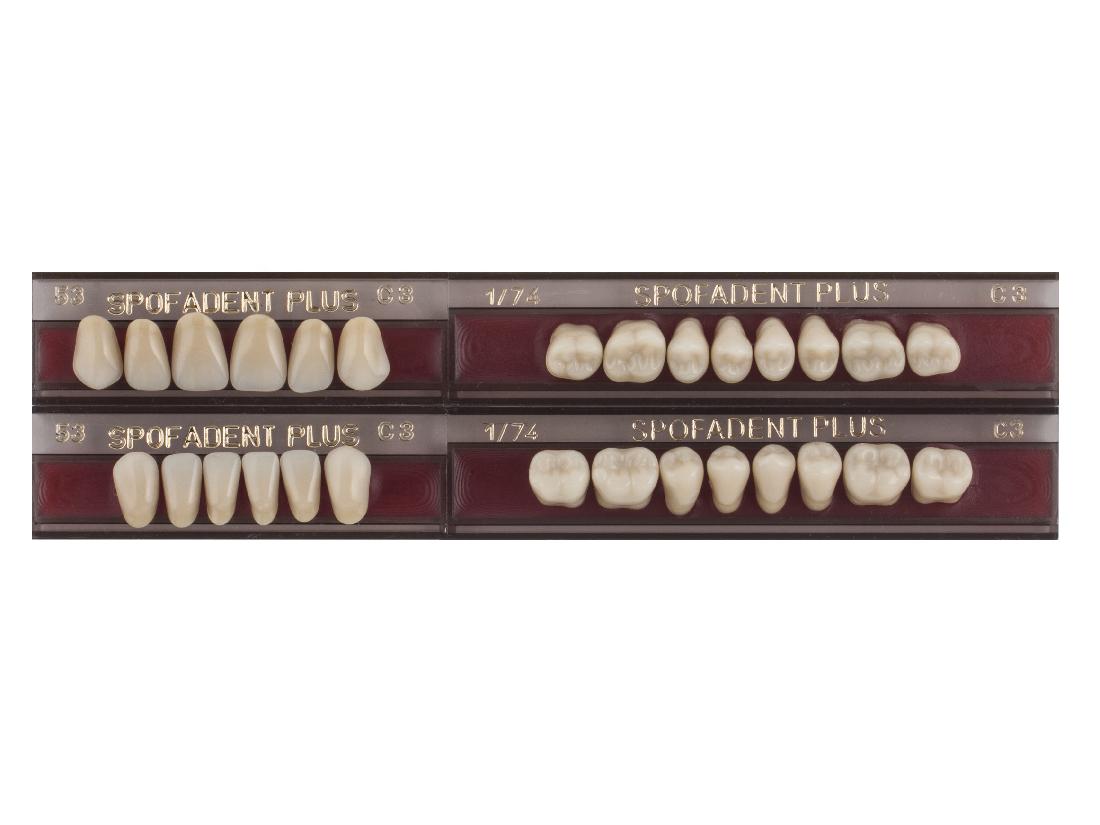 Акриловые зубы - цвет С3, для изготовления зубных протезов съёмного типа. Производятся из сополимеров метилметакрилата. К достоинствам пластмассовых зубов Спофадент Плюс можно отнести высокую цветостабильность, химическую стойкость, устойчивость к истиранию. Комплект – 28 зубов.