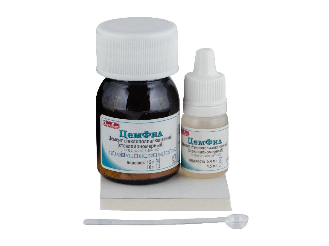 Рентгеноконтрастный цемент для реставрации эмали стандартного цвета А3. Алюмофторсиликатное стекло входит в состав порошка, в комплект входит так же полиакриловая кислота в растворе. Материал отличается высокой совместимостью с дентином и эмалью зуба, а фтор, входящий в его состав, долго депонируется в тканях и противостоит кариесу.