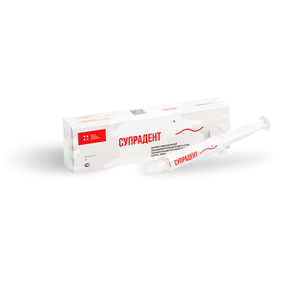 «Супрадент» и «Супрадент С» представляют собой готовую к применению рентгеноконтрастную пасту на основе гидроокиси кальция. Материал способствует образованию вторичного дентина, являющегося биологической защитой живой пульпы зуба. «Супрадент» и «Супрадент С» обладают антисептическим действием благодаря высокому рН среды и обеспечивают интенсивное антимикробное действие.