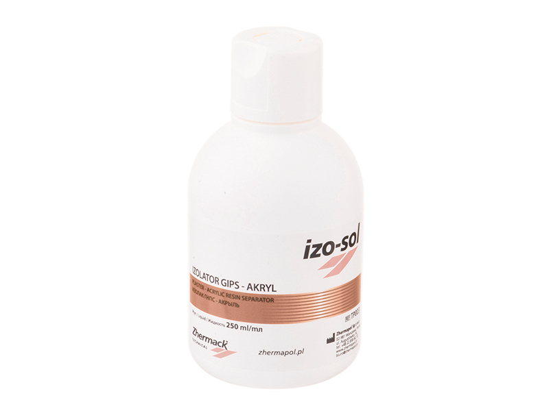 «Изосол» используют для изолирования форм из гипса от акриловых пластмасс. Вещество обладает бактерицидным свойством, имеет высокую проникающую способность по отношению к гипсу, не содержит формальдегид. «Изосол» экономичен, благодаря оптимальной густоте. Легко распределяется по поверхности, образуя тонкую пленку. Объем составляет 250 мл.