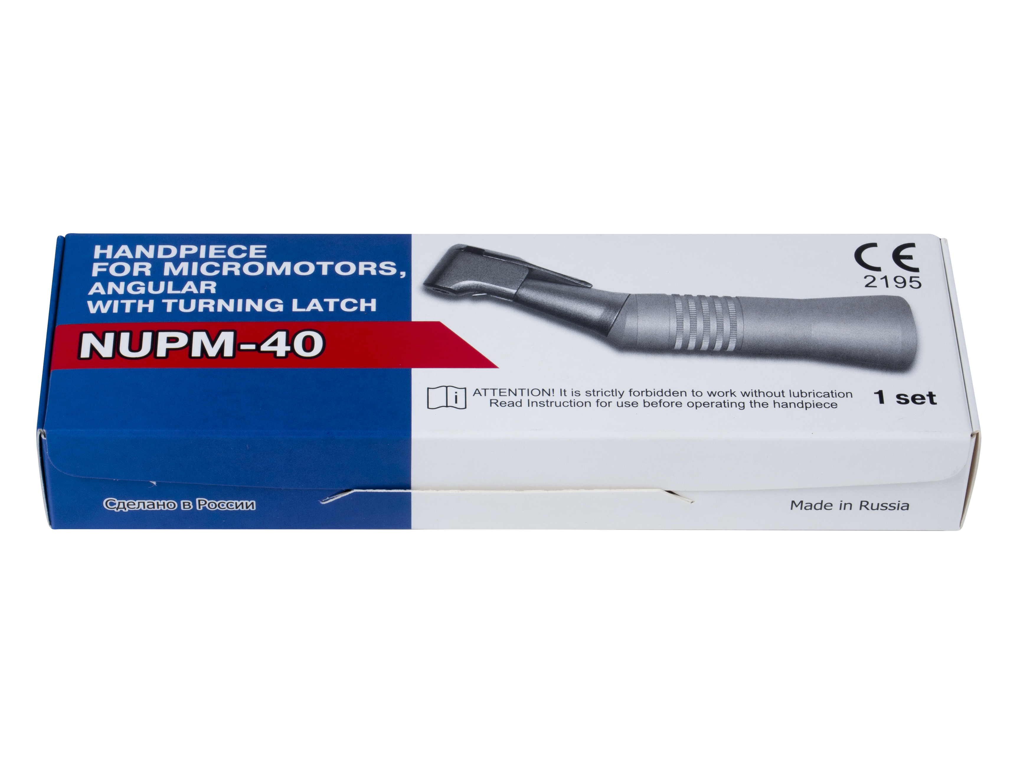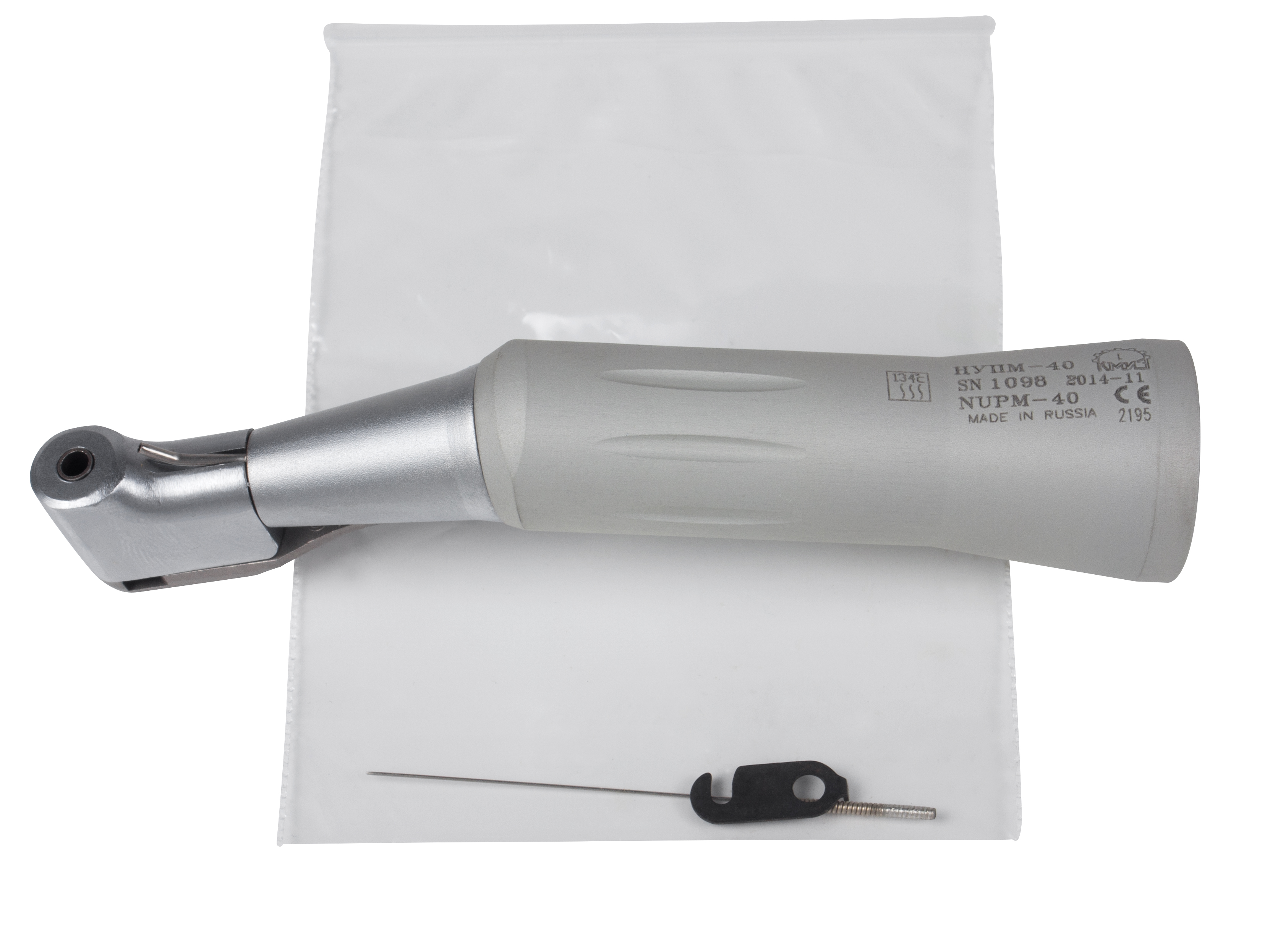 Преимущества этого углового наконечника заключаются в минимальном отклонении от оси вращения в 0.01мм, уровне шума, не превышающем 60 дБ, заменимости изношенных фиксаторов, высоком количестве оборотов в минуту (40000). Также в конструкции НУПМ-40 разработана система, исключающая трение в области крепления.