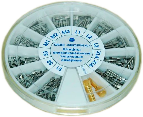Внутриканальные штифты из титана. Высокое качество исполнения и невысокая цена обеспечивают популярность в российских клиниках. Помимо широкого диапазона размеров инструмента: S1-3; M1-3; L1-3; XL4 и XL6 (по 22 штуки), в набор входят крестовой и внутренний ключи.