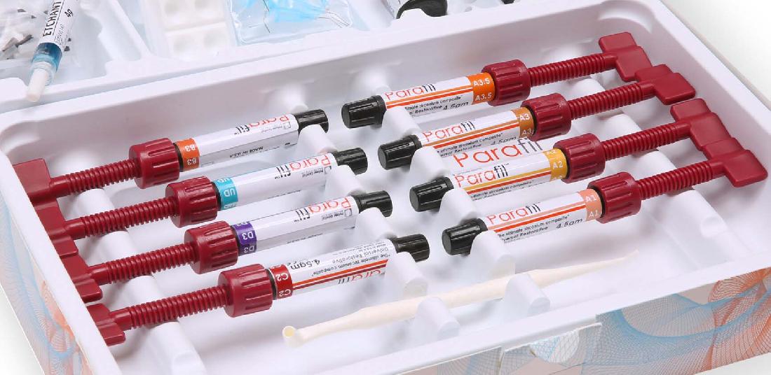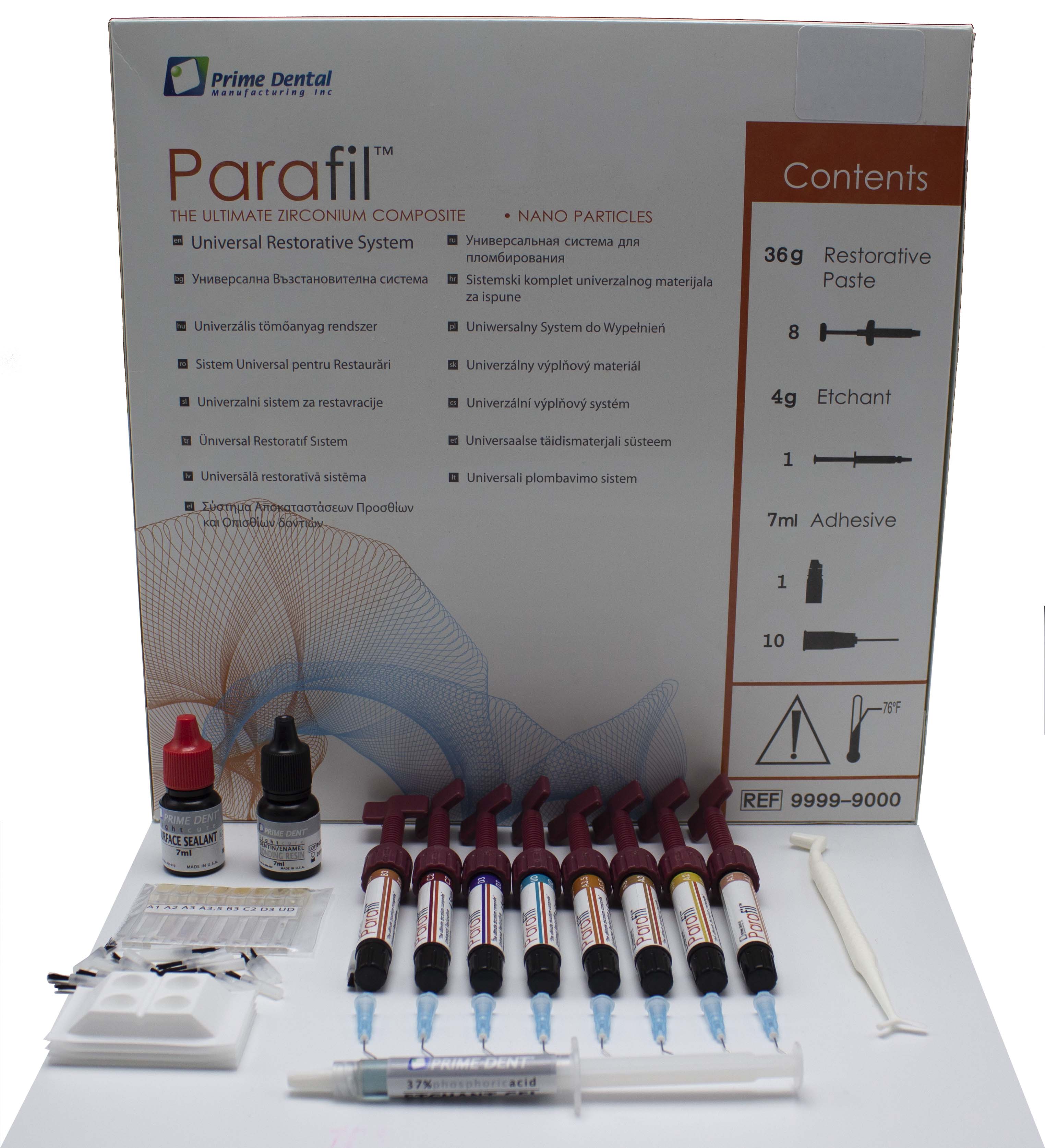 В набор Композит "ПАРАФИЛ" (8 шпр*4,5гр) входит: 8 шпр. по 4,5гр ( цв А1, А2, А3, А3.5, В3, С2, Д3, UD) 4 гр протравочного геля 7 мл. адгезива 10 канюль аксессуары.