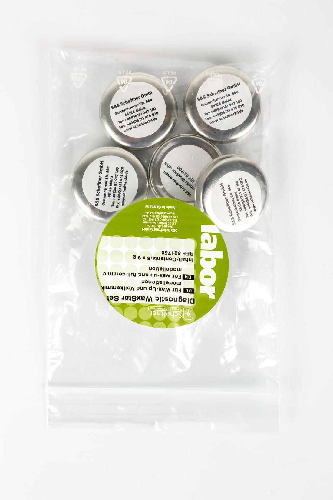 Набор диагностического воска Set 5 x 9 g, который можно использовать для моделей из прессованной керамики и воска. В составе материала компоненты органического происхождения, благодаря чему он сгорает полностью. Форма поставки: баночки по 70 г.