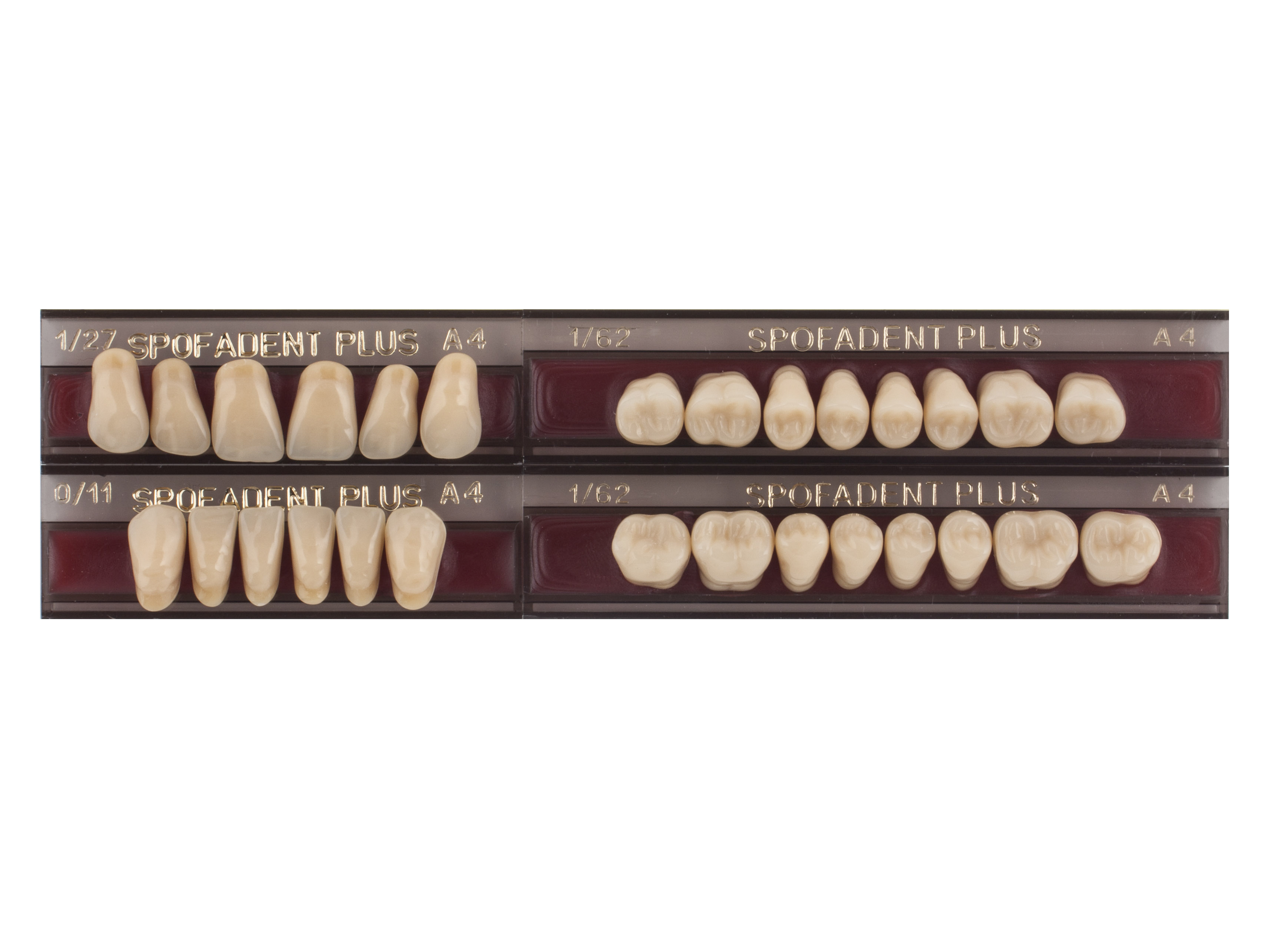 Акриловые зубы - цвет А4 для изготовления зубных протезов съёмного типа. Производятся из сополимеров метилметакрилата. К достоинствам пластмассовых зубов Спофадент Плюс можно отнести высокую цветостабильность, химическую стойкость, устойчивость к истиранию. Комплект – 28 зубов.