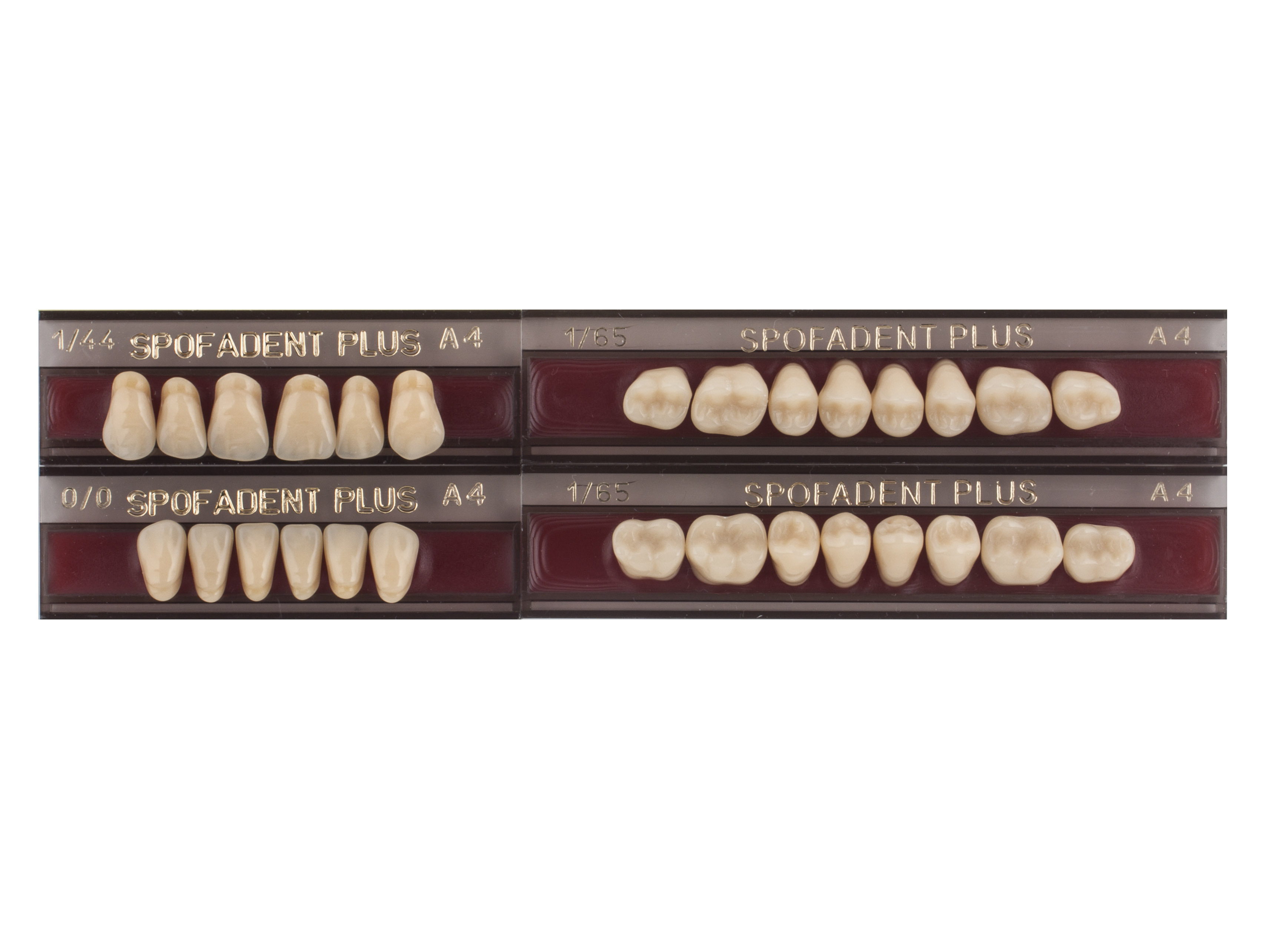 Акриловые зубы - цвет А4 для изготовления зубных протезов съёмного типа. Производятся из сополимеров метилметакрилата. К достоинствам пластмассовых зубов Спофадент Плюс можно отнести высокую цветостабильность, химическую стойкость, устойчивость к истиранию. Комплект – 28 зубов.