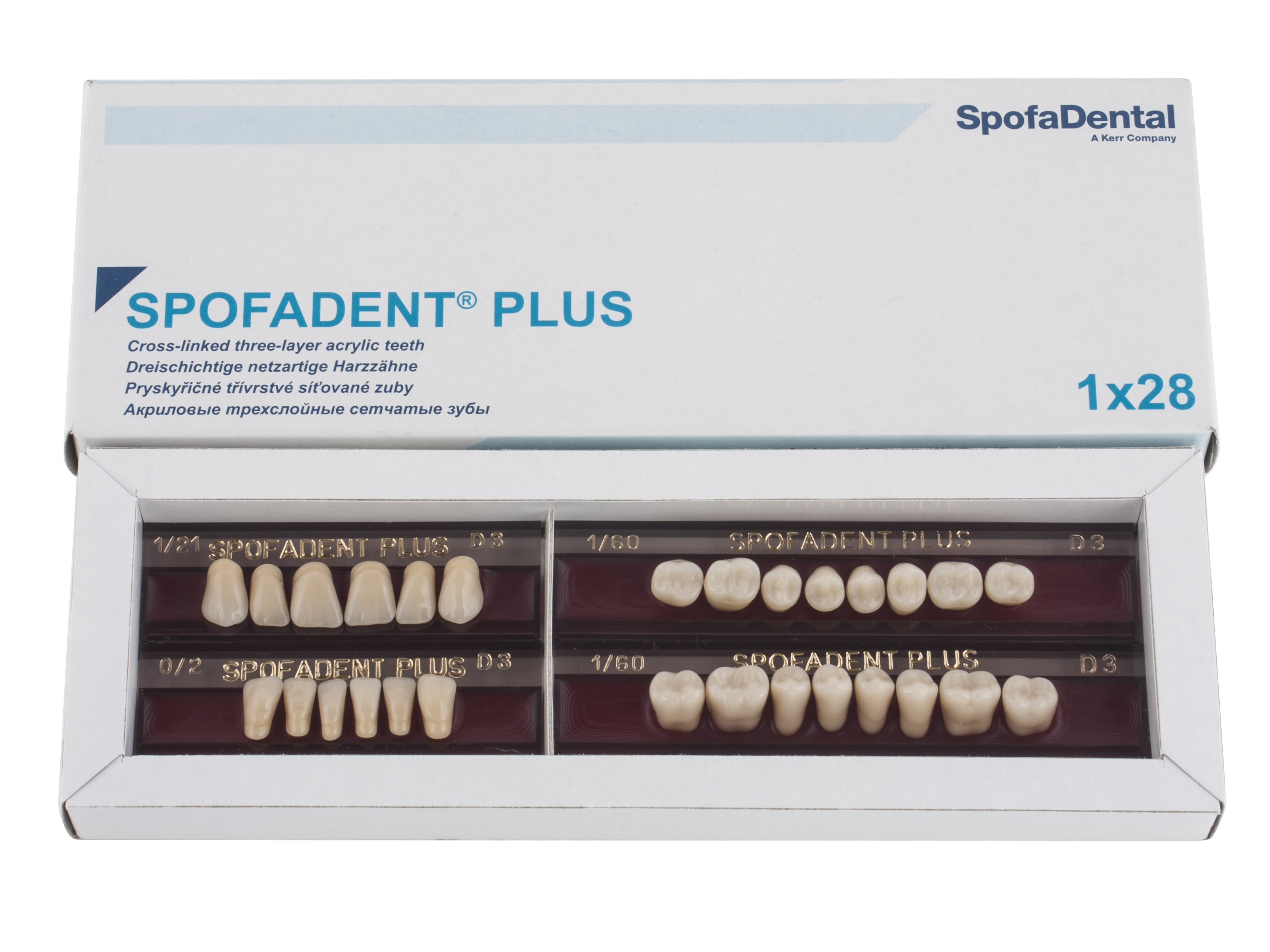 Акриловые зубы - цвет D3, для изготовления зубных протезов съёмного типа. Производятся из сополимеров метилметакрилата. К достоинствам пластмассовых зубов Спофадент Плюс можно отнести высокую цветостабильность, химическую стойкость, устойчивость к истиранию. Комплект – 28 зубов.
