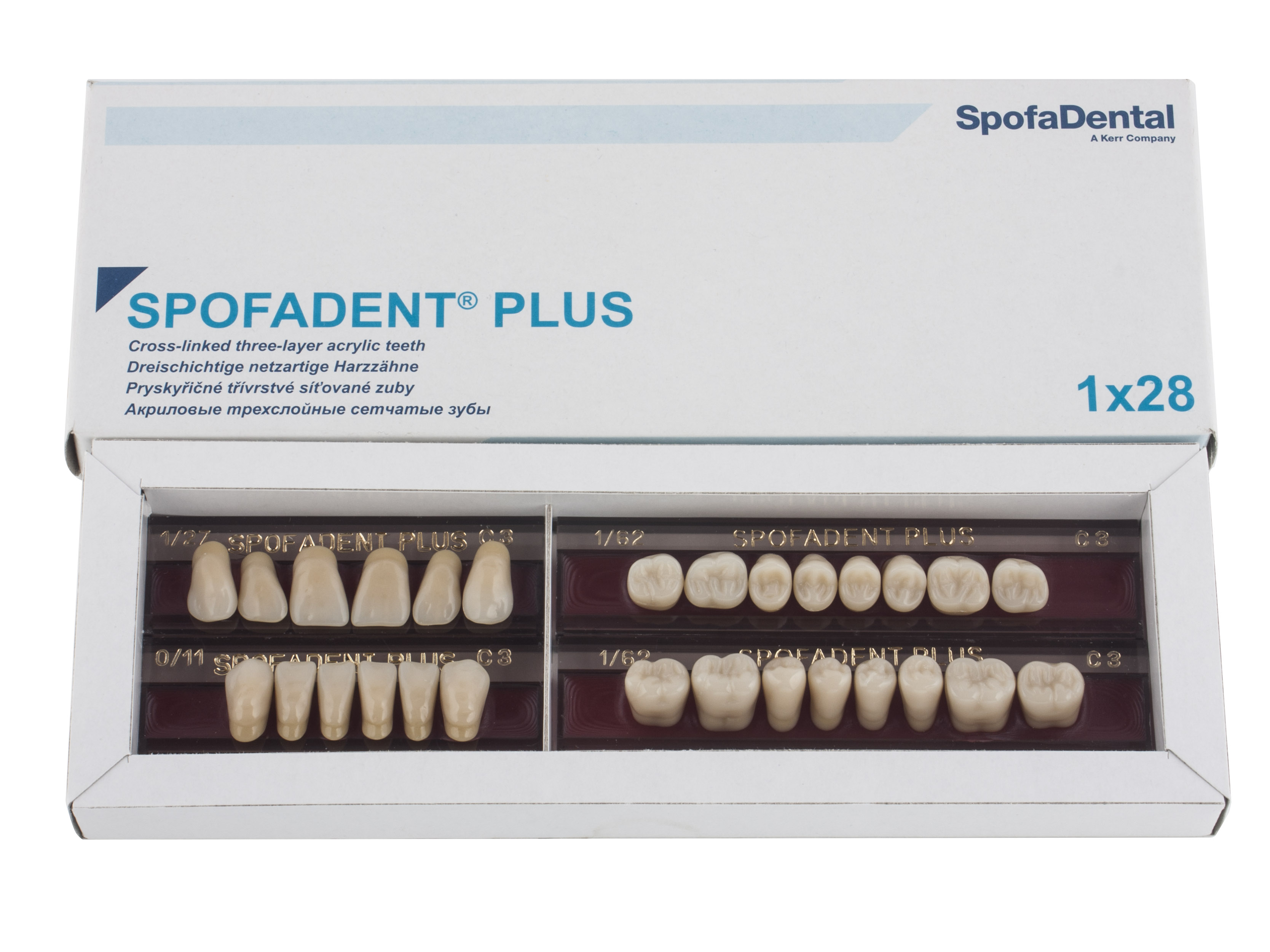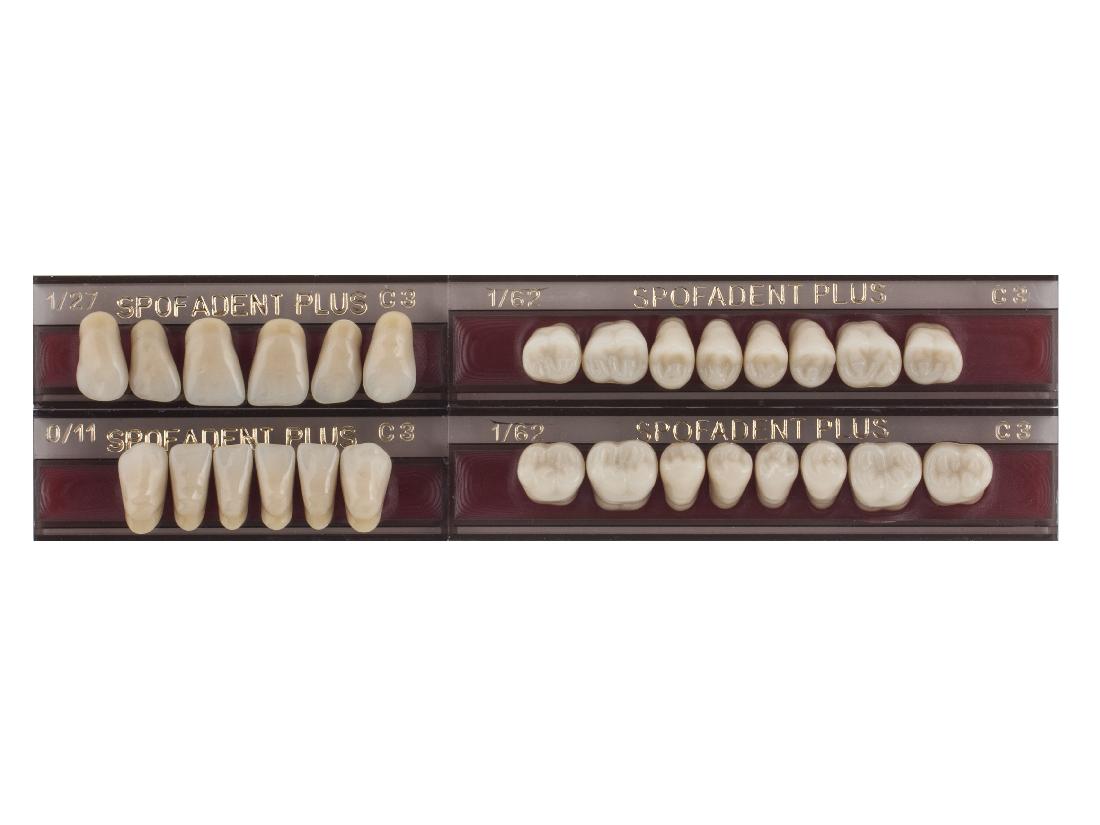 Акриловые зубы - цвет С3, для изготовления зубных протезов съёмного типа. Производятся из сополимеров метилметакрилата. К достоинствам пластмассовых зубов Спофадент Плюс можно отнести высокую цветостабильность, химическую стойкость, устойчивость к истиранию. Комплект – 28 зубов.
