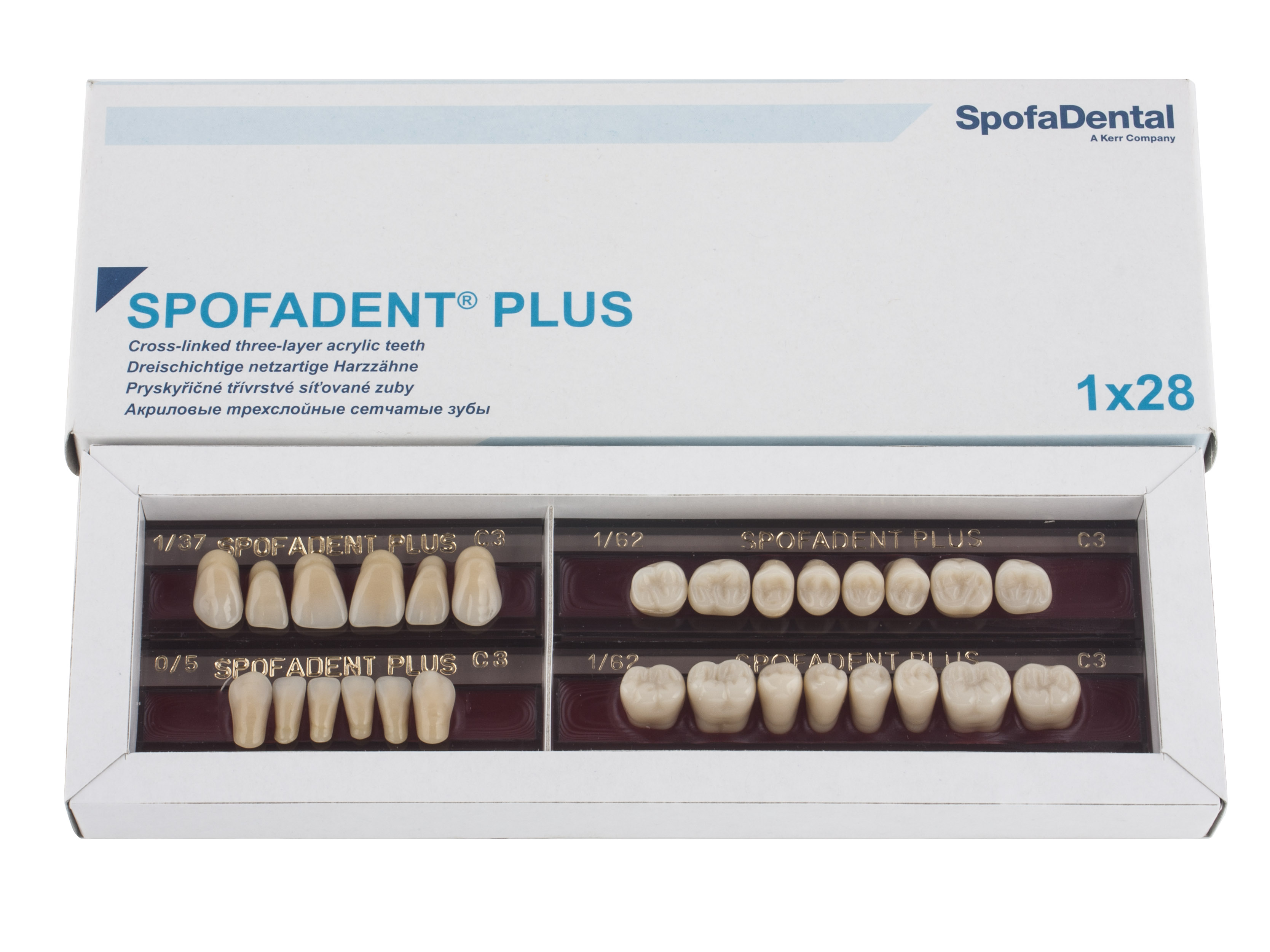 Акриловые зубы - цвет С3, для изготовления зубных протезов съёмного типа. Производятся из сополимеров метилметакрилата. К достоинствам пластмассовых зубов Спофадент Плюс можно отнести высокую цветостабильность, химическую стойкость, устойчивость к истиранию. Комплект – 28 зубов.