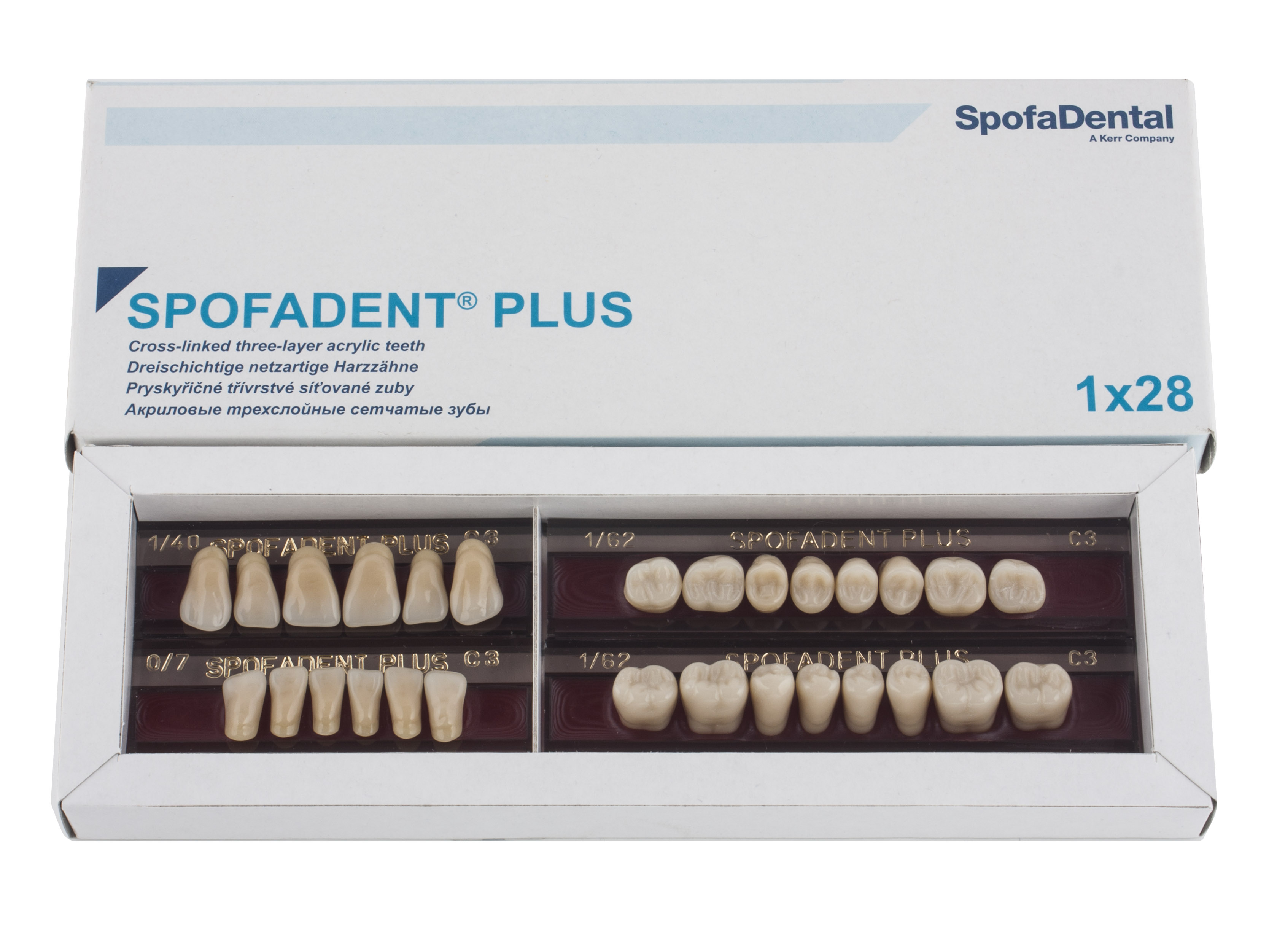 Акриловые зубы - цвет С3, для изготовления зубных протезов съёмного типа. Производятся из сополимеров метилметакрилата. К достоинствам пластмассовых зубов Спофадент Плюс можно отнести высокую цветостабильность, химическую стойкость, устойчивость к истиранию. Комплект – 28 зубов.