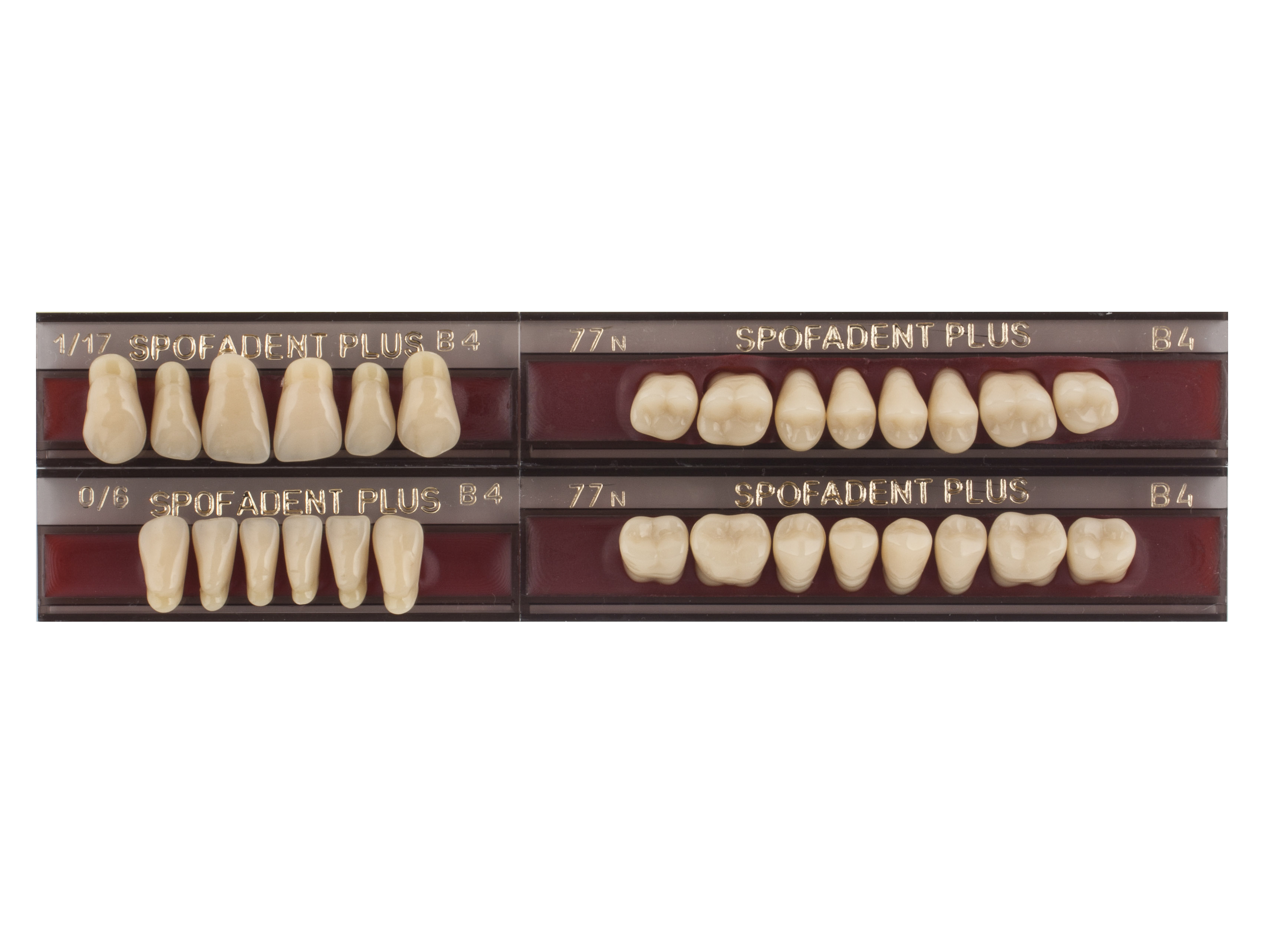 Акриловые зубы - цвет В4, для изготовления зубных протезов съёмного типа. Производятся из сополимеров метилметакрилата. К достоинствам пластмассовых зубов Спофадент Плюс можно отнести высокую цветостабильность, химическую стойкость, устойчивость к истиранию. Комплект – 28 зубов.
