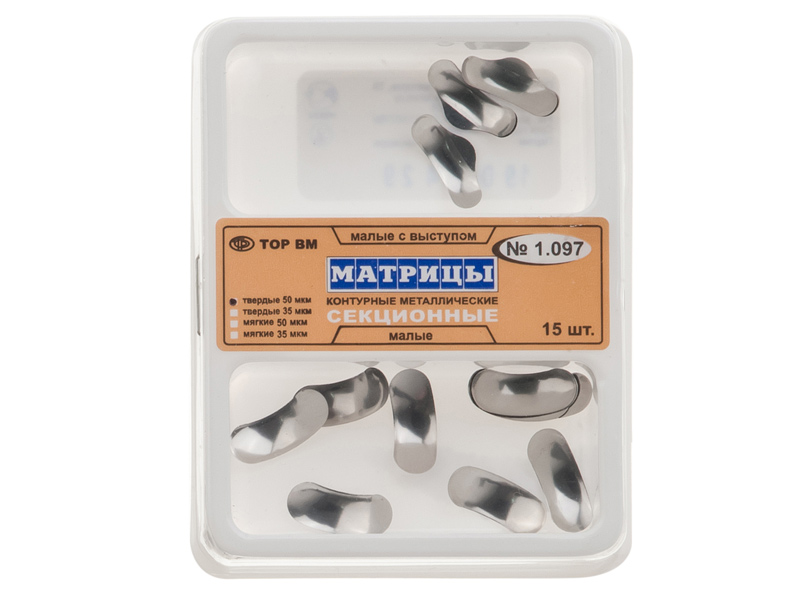 Данный набор матриц, применяемых при реставрации второго типа, необходим для разделения аппроксимальных участков зубов. Матрицы имеют вогнутую форму, состоят из стойкой к коррозии стали, легко устанавливаются и позволяют без труда проводить реставрацию на проблемных участках зуба.
