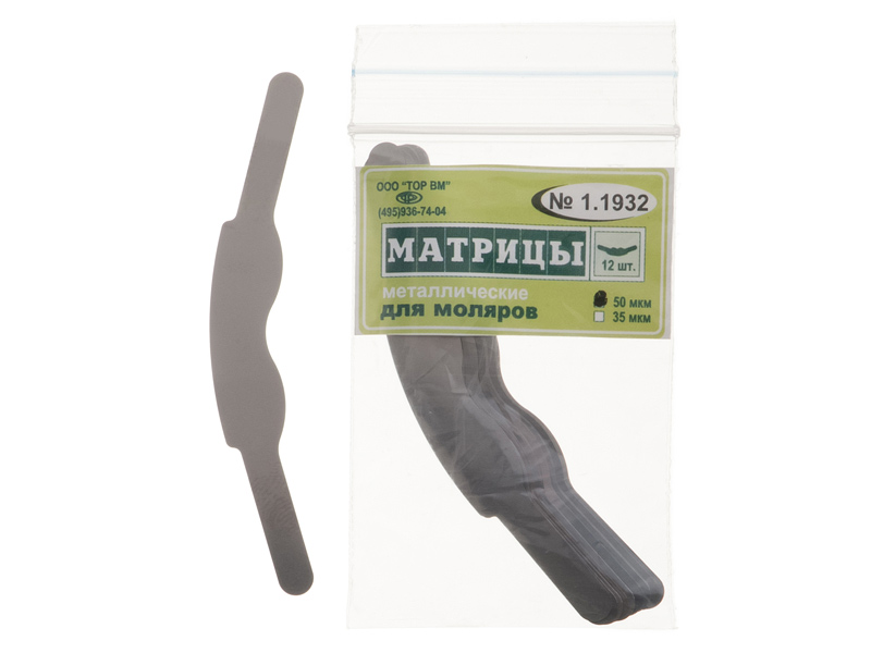Плоские контурные матрицы второй формы для реставраций моляров. Изготовлены из особой стали, устойчивой к коррозии. Разделяют апроксимальные поверхности рядом стоящих зубов и контурируют пломбы при применении композиционного материала.