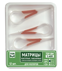 Самоклеящиеся матрицы крепятся без фиксатора с помощью клейкой прослойки по периметру плоской поверхности, граничащей с рабочей зоной. Лавсановые матрицы имеют четыре формы выпуска для коренных зубов боковой группы (моляров), различающиеся между собой количеством придесенных выступов и их распределением.