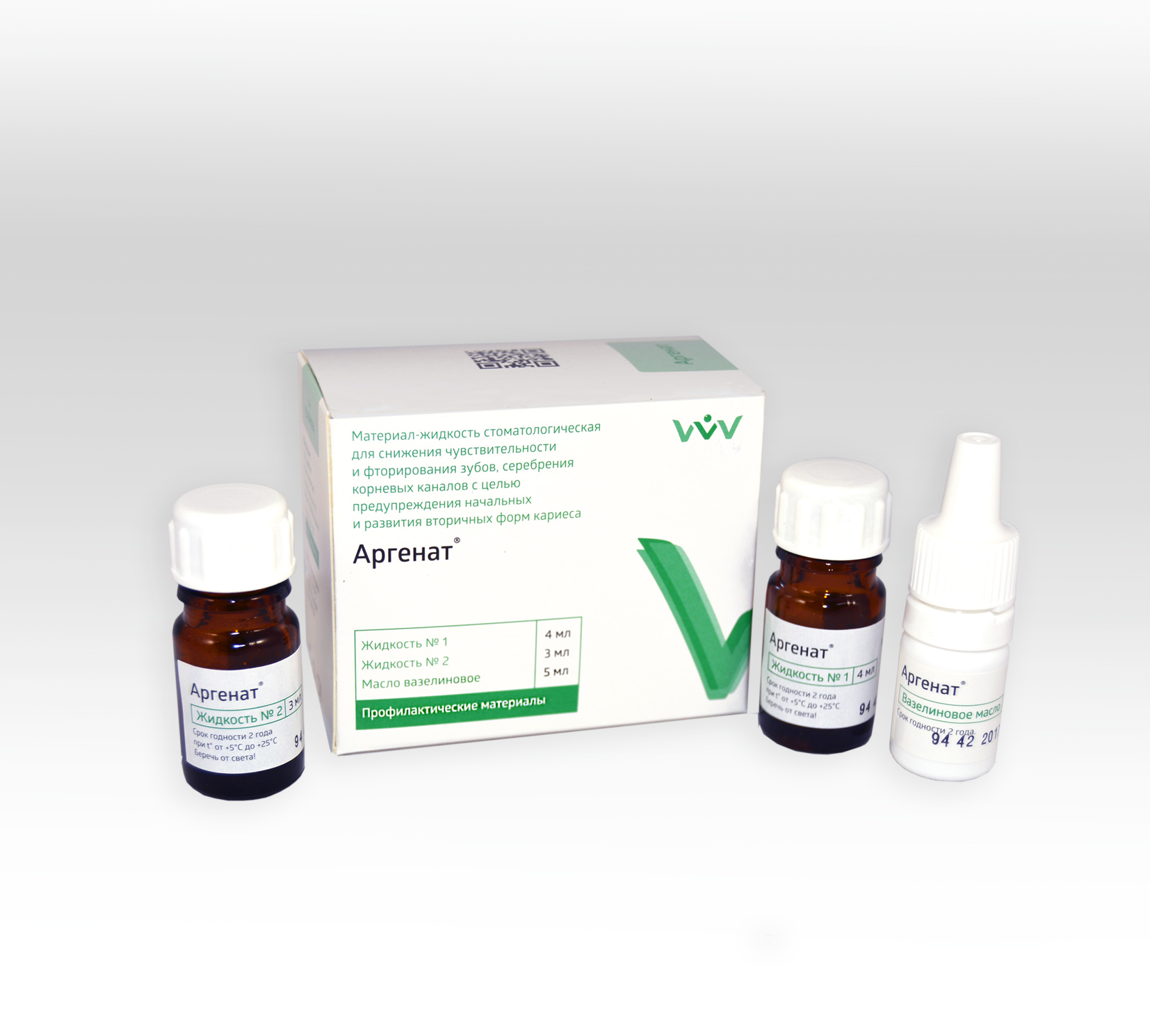 Препарат на вазелиновой основе состоит из двух компонентов – серебро (ионная форма) и восстановитель серебра. Аргенат используют при поражении кариесом молочных и коренных зубов, для обработки (серебрения) пораженных корневых каналов. Аргенат - препарат пролонгированного бактерицидного действия, подавляет деструктивные ферменты.