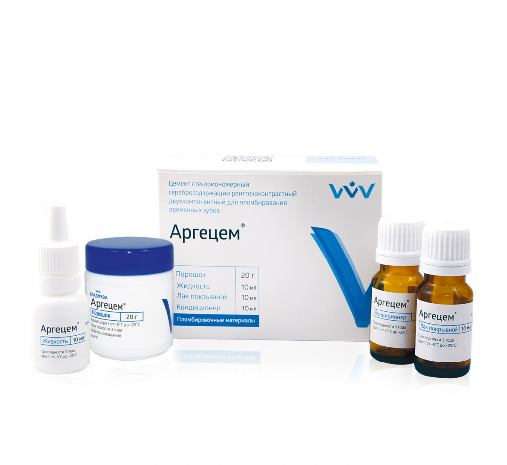 Цемент Аргецем рентгеноконтрастный, стеклоиономерный, фторвыделяющий, используется в лечении молочных и коренных зубов (кроме фронтальных), запечатывания туннелей, создании зубной культи – основы под коронку, фиссурной герметизации, в качестве подложки для композитов. Микрочастицы серебра обеспечивают прочность и износостойкость цемента, химическую адгезию к дентину.