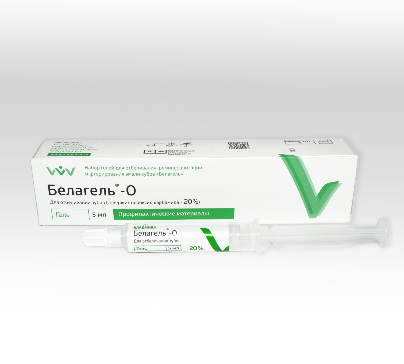 С помощью Белагель-О (шприц 5 мл) устраняют дисколорации разного происхождения, отбеливают зубы с удаленным нервом. Гель изготовлен на водной основе (30%), поэтому не обезвоживает ткань зуба, сохраняет его натуральный блеск. Белагель-О содержит пероксид карбамида (20%) - самый щадящий отбеливающий компонент, который кроме отбеливающего так же обладает антибактериальным свойством.
