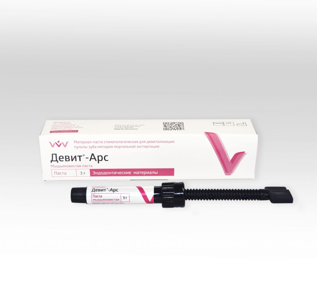 Препарат в виде пасты для быстрой и безболезненной девитализации пульпы.. В составе присутствует 30% мышьяк, который обеспечивает умертвение тканей, анестетик для обезболивания, антисептик эвгенол, волокнистый наполнитель и пастообразователь, обеспечивающие пластичность и дискретность вещества. Процесс длится 24-48 часов, нельзя оставлять препарат в полости больше, чем на 72 часа. Готов к использованию .Объем препарата 3г.