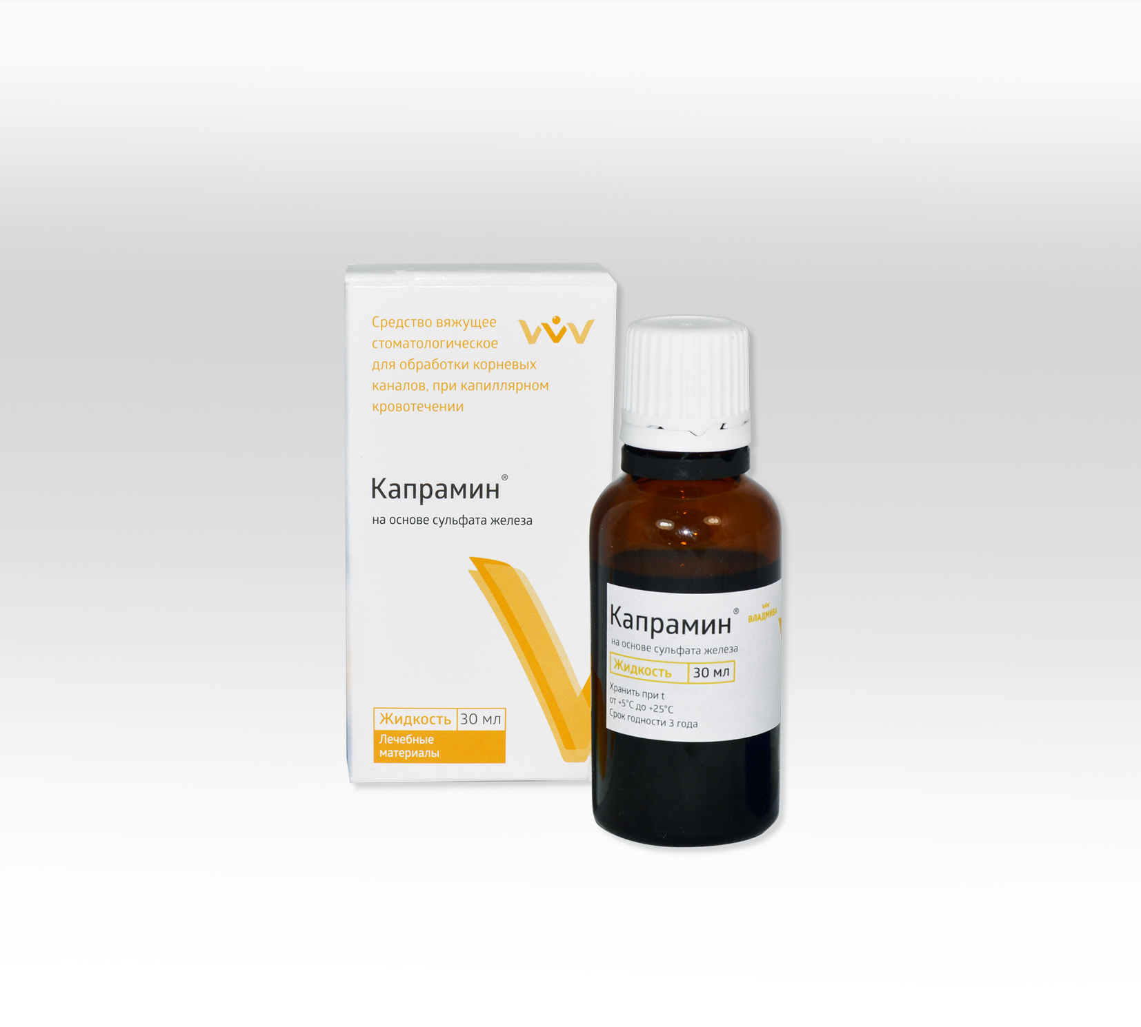 Гемостатическое средство. Входящий в «Капрамин» AlCl3 усиливает бактерицидное действие центимониума бромида. Используется при кровотеченях из корневых каналов и десен, снятии камня с зубов, обработки лунок, ретракции десны. «Капрамин» не изменяет цвет обрабатываемых тканей, смывается водой, не оказывает токсического влияния.