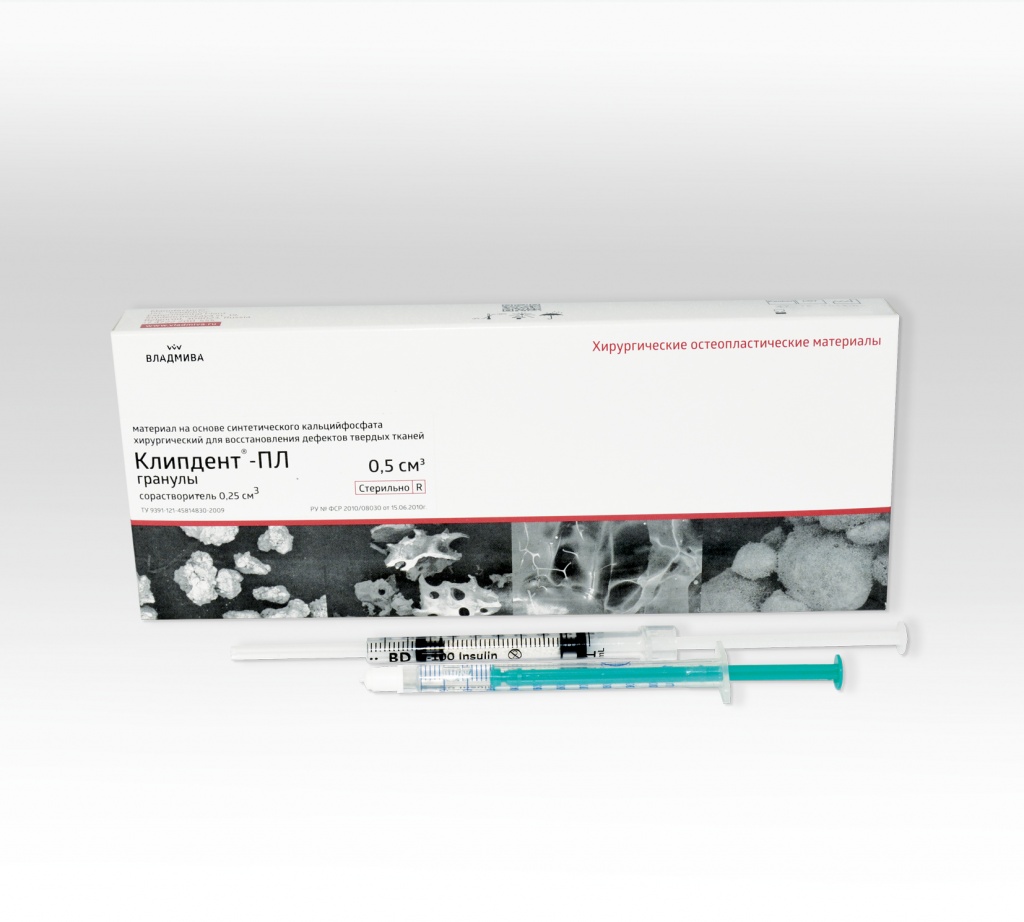 Остеокондуктивный материал «Клипдент-ПЛ сорастворитель» состоит из гранул -трикальцийфосфата (-ТКФ) покрытых тонкой оболочкой биодеградируемого сополимера полилактидгликолида и сорастворителя. После смешивания гранул с сорастворителем, гранулы склеиваются между собой, образуя пластичный материал с высокой микро- и межгранулярной пористостью, который можно вводить в костный дефект непосредственно из шприца. При контакте с кровью или ротовой жидкостью материал приобретает форму костного дефекта, что обеспечивает стабильность его в дефекте и облегчает процедуру ушивания раны. Биоматериал полностью резорбируется в течение 9-15 месяцев. Резорбция протекает параллельно регенерации костной ткани.
