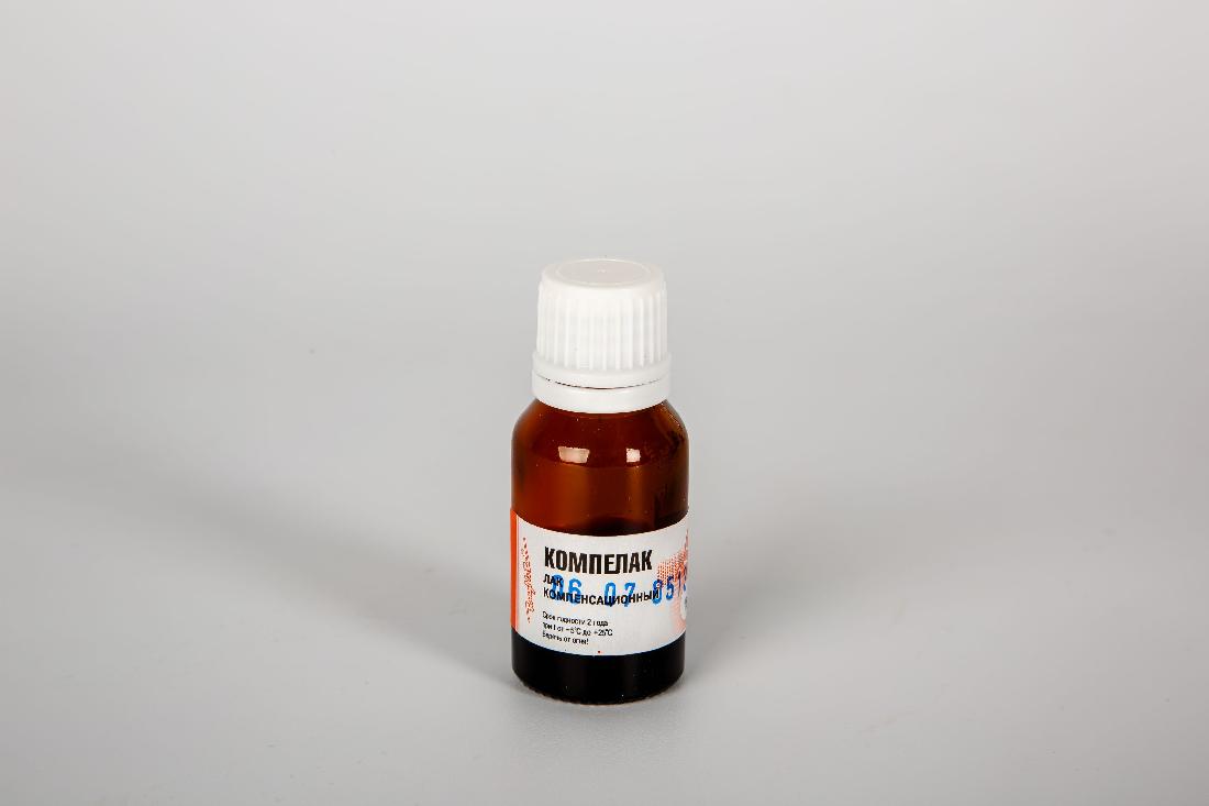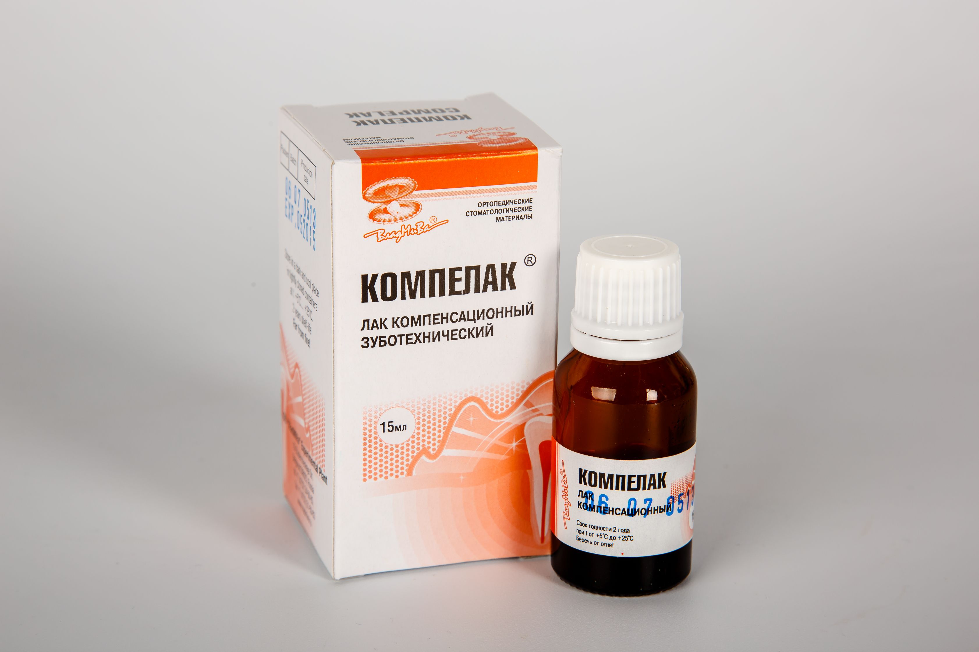 Компелак представлен вязкой жидкостью, которая высыхая, образует плёнку без усадки. Процесс образования пленки - три минуты. Один слой имеет толщину около 11 мкм. Материал компенсирует усадку при изготовлении зубных протезов. Использование компелака способствует укреплению и длительному использованию протеза.