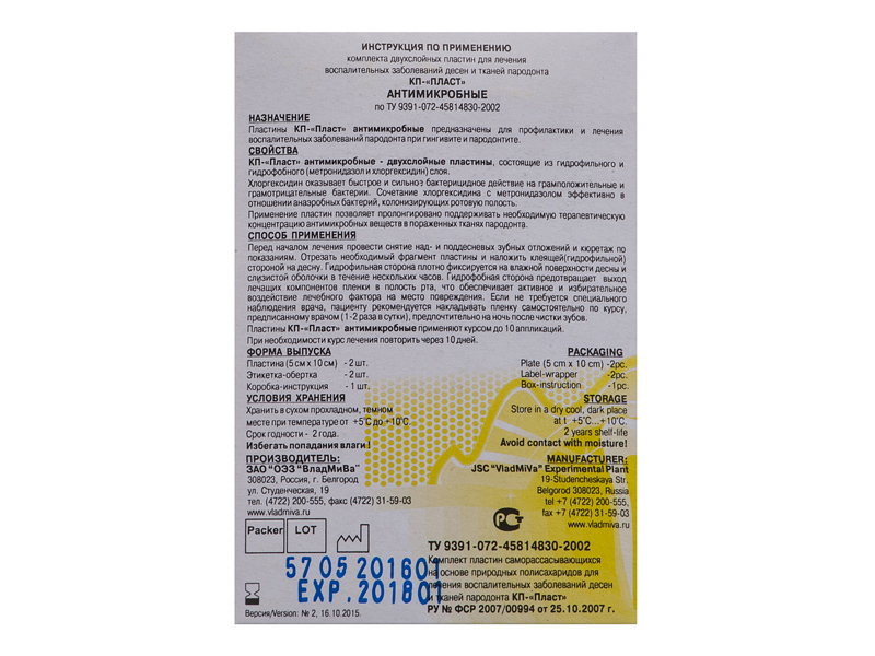 Антимикробный КП-Пласт способствует лечению и профилактике воспалений полости рта. Хлоргексин и метронидазол в своем сочетании оказывают эффективную борьбу с колонизирующими полость рта анаэробными бактериями.