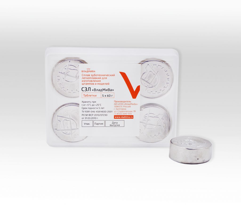 Материал представляет собой сплав металлов на основе висмута, олова, свинца. Используется для изготовления вспомогательных моделей и копир-штампов, по которым отливают зубные протезы. Обладает твердой консистенцией, легко подвергается обработке. Отличается низкой температурой плавления (96о) и слабой усадкой при охлаждении. Фасовка 5 таблеток по 60 г (300г).