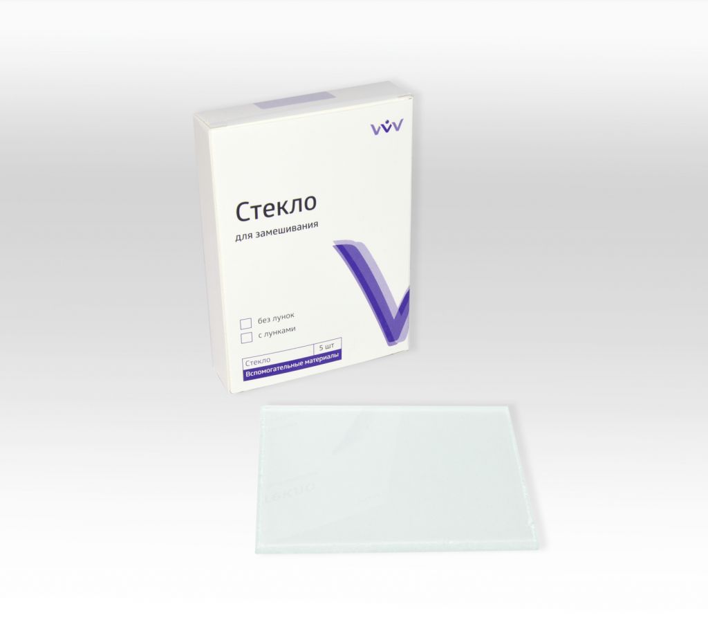 Приспособление для замешивания различных стоматологических препаратов: цементов, пастобразных веществ, смесей и др. Представлено в виде отшлифованной стеклянной пластины, размером 100х70 мм и толщиной 4 мм. Не имеет лунок, одна сторона глянцевая, вторая матовая.